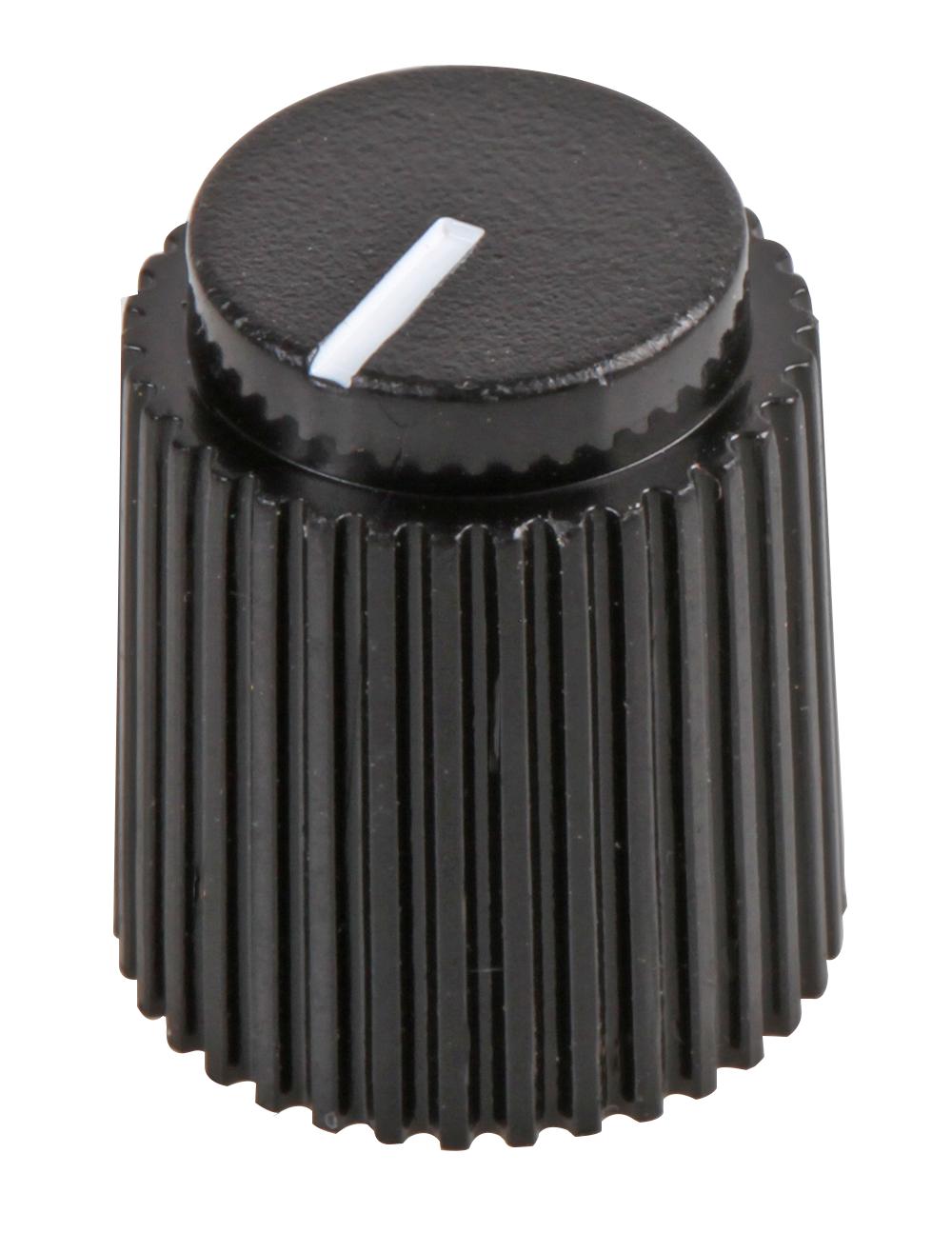 The CP-AE14-6-S(6.4)H is a 13.8mm Round Knob with top indicator line, made of ABS in black colour.