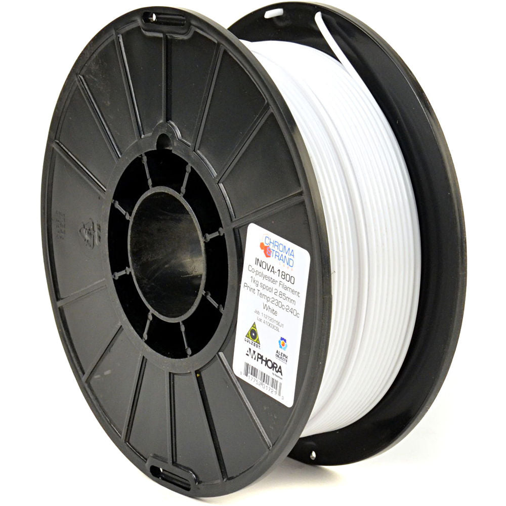 The white 3mm INOVA-1800 Filament from Chroma Strand Labs features a co-polyester material made from Eastman Amphora 1800 3D polymer and a glossy, smooth finish.
