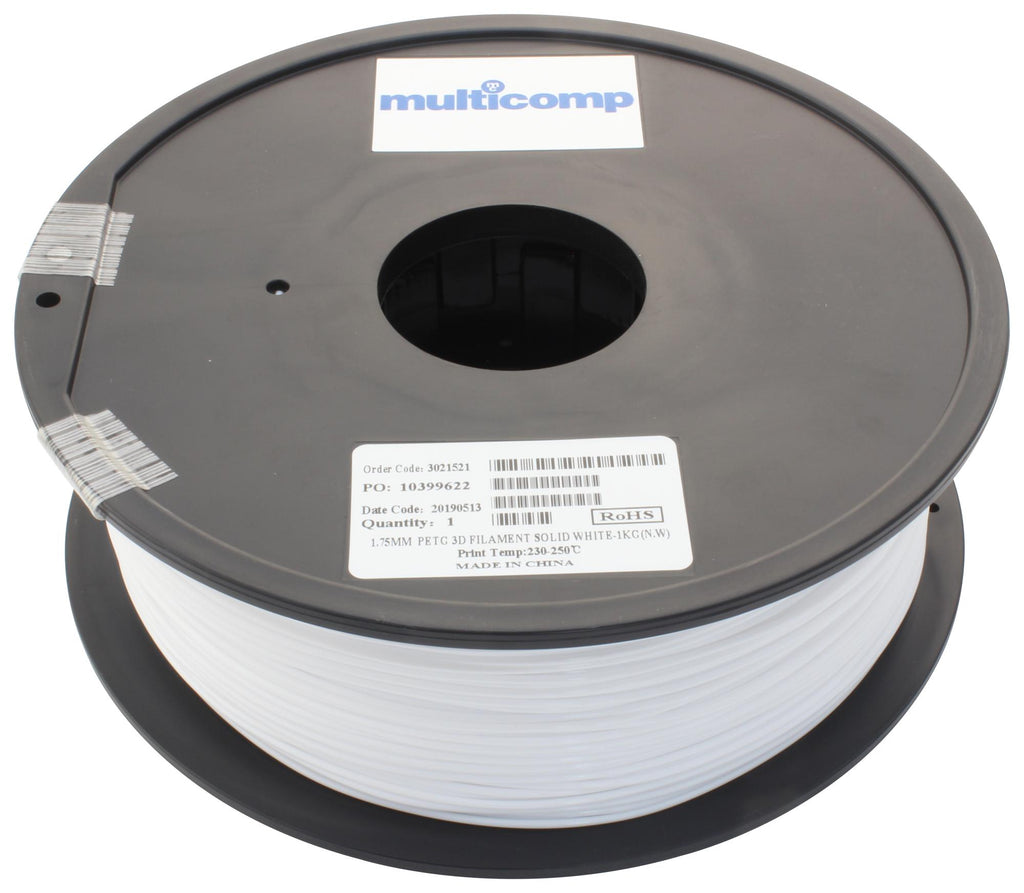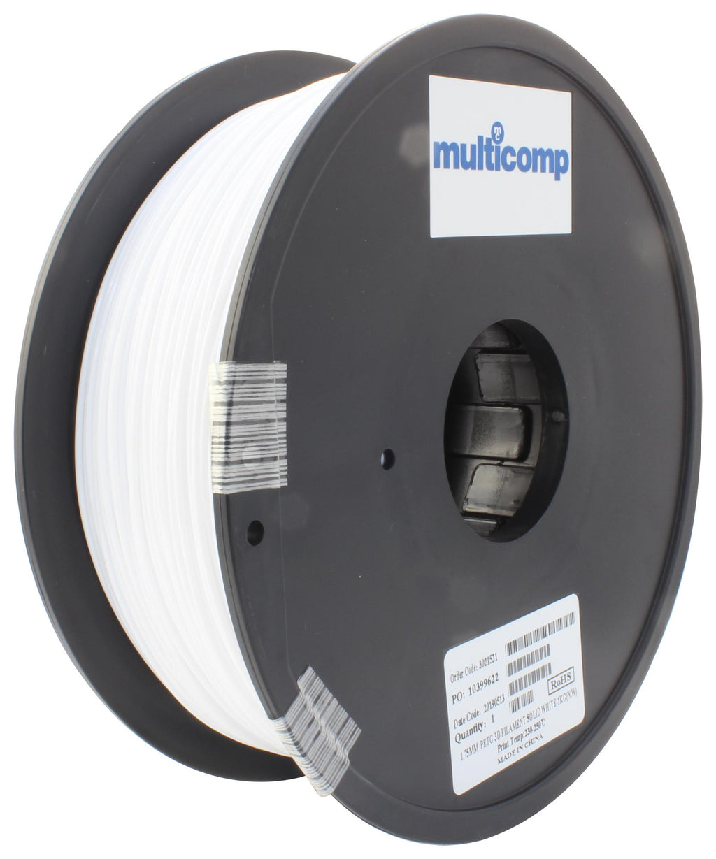 This is a 3D Printer Filament, PETG, 1.75 mm, Solid White, 250 °C Melting Temp product from MULTICOMP with the model number MC011467