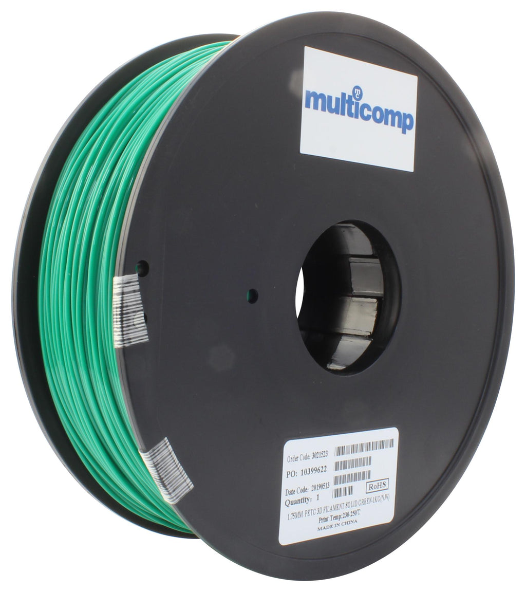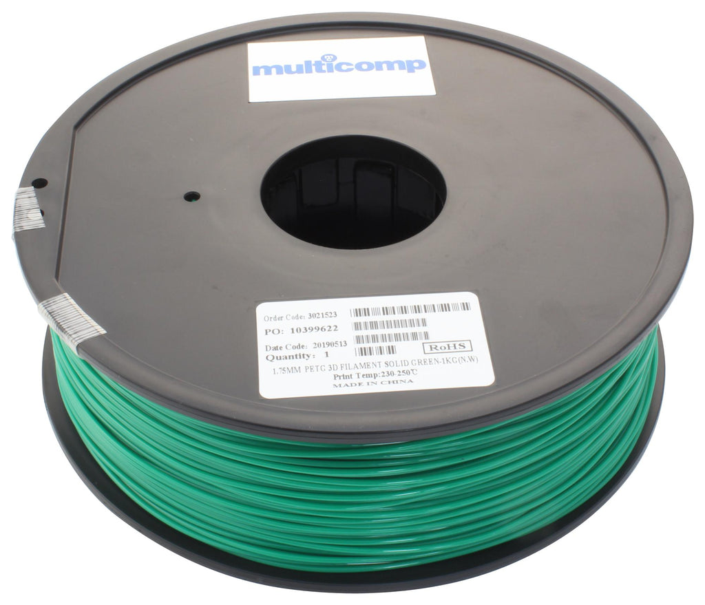This is a 3D Printer Filament, PETG, 1.75 mm, Solid Green, 250 °C Melting Temp product from MULTICOMP with the model number MC011469