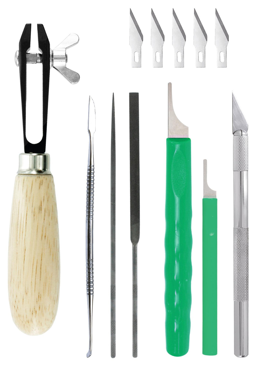 Craft knife, 5x spare #11 blades, Micro mouldline tool, Large mouldline tool, 2 files (flat & round), Double ended carver, Smooth jaw hand vice.