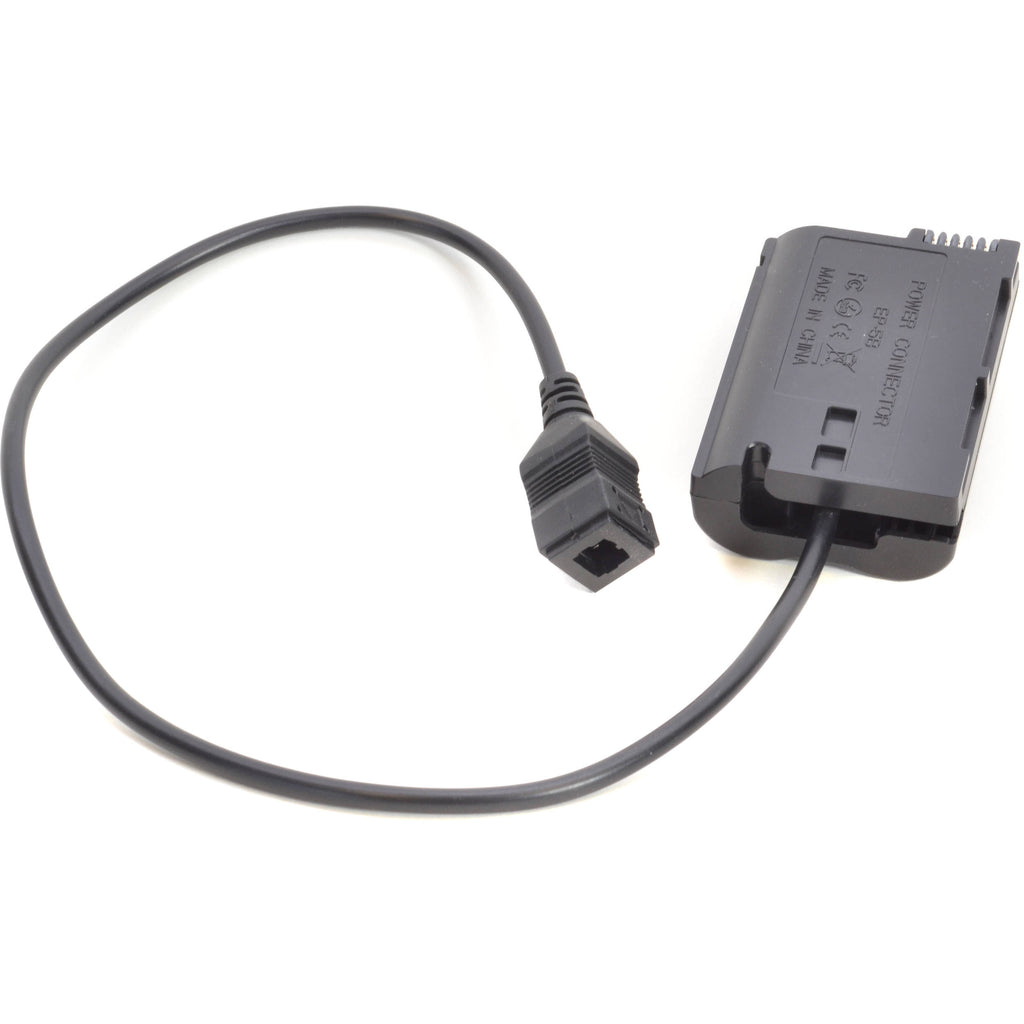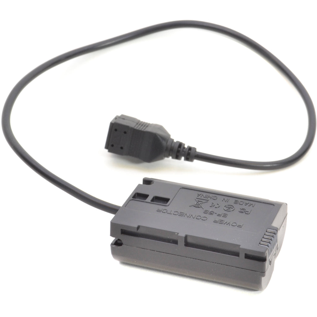 The EP5 Dummy Battery for Select Nikon Cameras from Bescor inserts inside the chamber of the camera body, and then it connects to the compatible EH5 AC adapter to supply power to the camera.