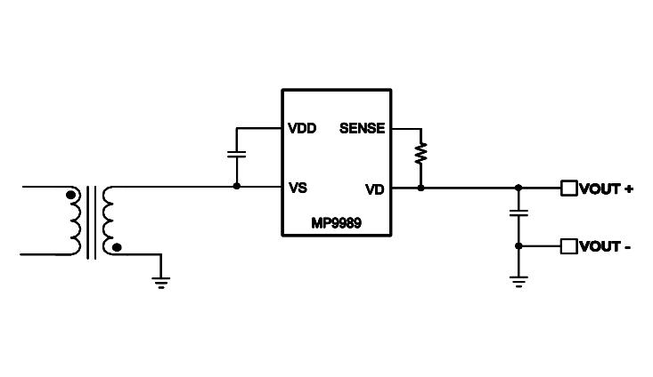 The MP9989 is a fast turn-off, intelligent rectifier for flyback converters that integrates a 100V MOSFET. It can replace a diode rectifier for higher efficiency and power density. The chip regulates the forward voltage drop of the internal power switch to 40mV and turns off before the drain-source voltage reverses. The MP9989 can generate its own supply voltage without the need for auxiliary winding, which makes it suitable for charger applications with a low output voltage requirement or any other adaptor applications with high-side set-up. The internal ringing detection circuitry prevents the MP9989 from falsely turning on during discontinuous conduction mode (DCM) or quasi-resonant operations.