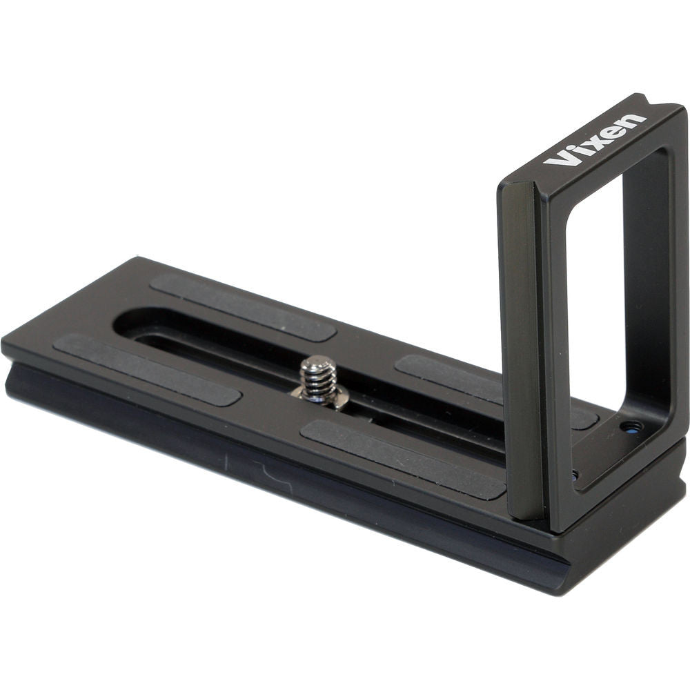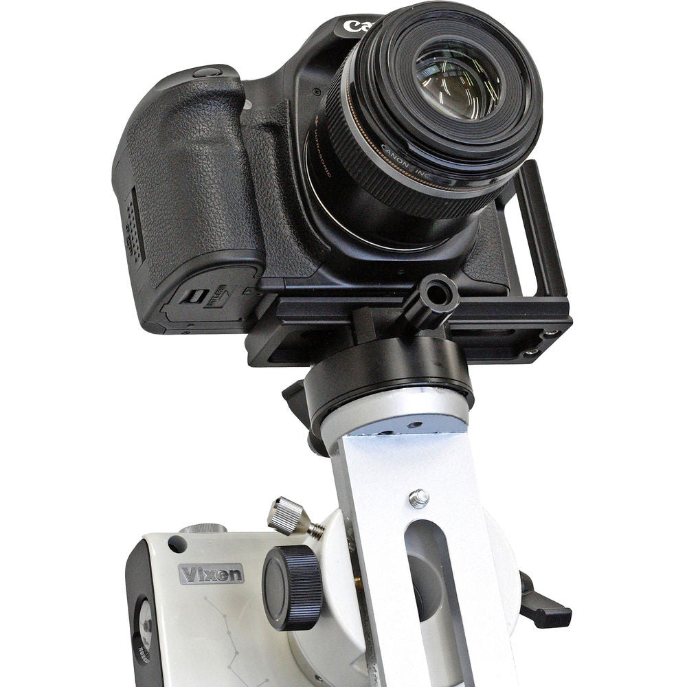 Designed to fit their Polarie Quick Release Panorama Clamp, the Vixen Optics Polarie Quick Release Angle Plate provides an easy and stable way to attach your camera or smaller OTA onto the tracking system counterbalance rig. Using this clamp-plate combination brings the camera body closer to the center of gravity while adding much more strength and stability versus conventional ball heads.
