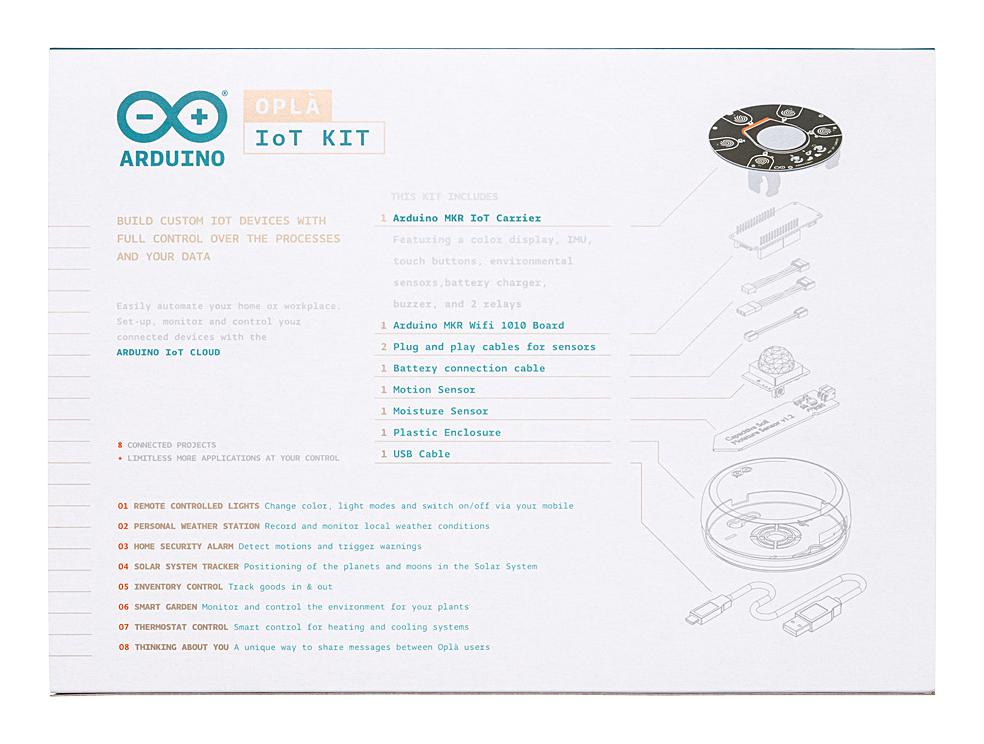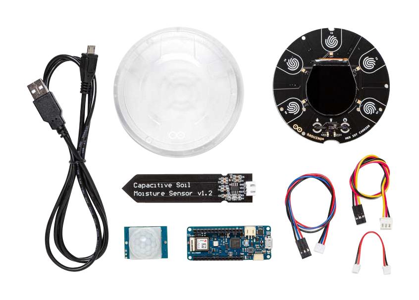 MKR IoT Carrier, Arduino MKR Wi-Fi 1010, Plastic encasing, Micro USB cable, Moisture sensor, PIR sensor, Plug-and-play cables for all the sensors.