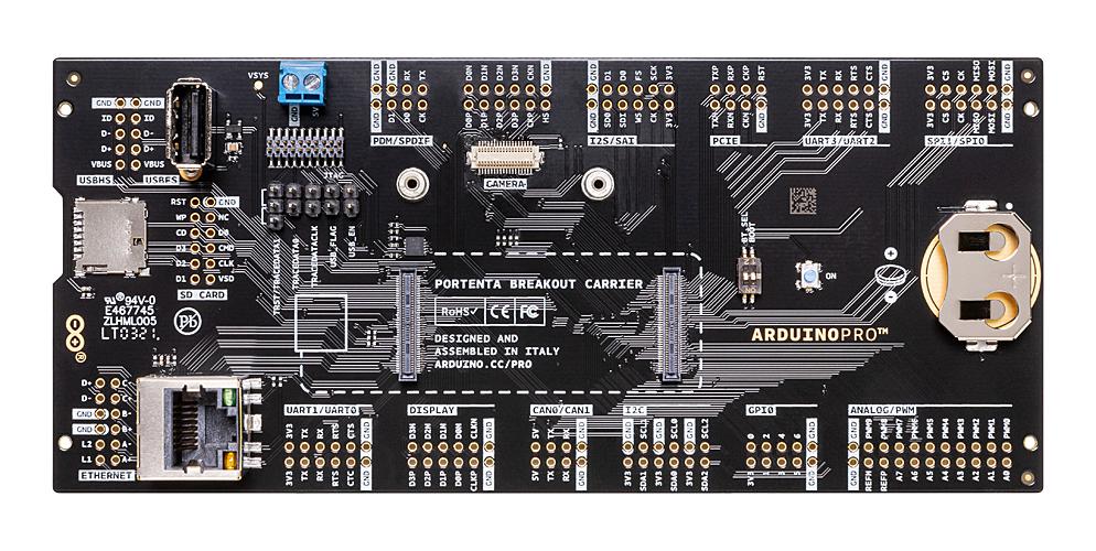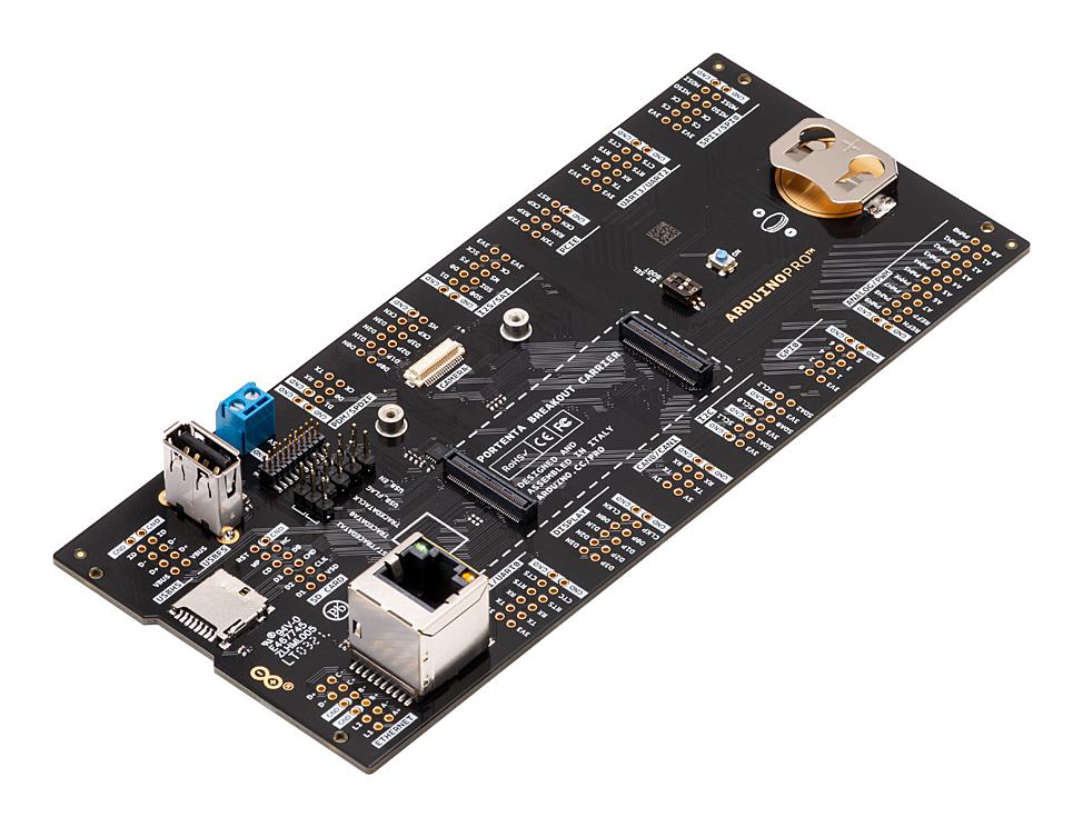 Arduino Portenta breakout board is designed to assist developers with their prototypes by exposing the high-density connectors of the Portenta family on both sides of the breakout carrier, providing total flexibility for measuring and controlling signals - developing your own hardware, testing the design and measuring the input and output signals out of the high-density connectors.