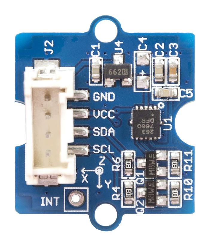 Grove - 3-Axis Digital Accelerometer(±1.5g) module is based on MMA7660FC with Digital Output I2C. You can use module in the application of sensing data changes, product orientation, and gesture detection through an interrupt pin (INT). Typical applications include motion detection of robot, mobile phone/ PMP/PDA: orientation detection (portrait/landscape), image stability, text scroll, motion dialling, tap to mute.