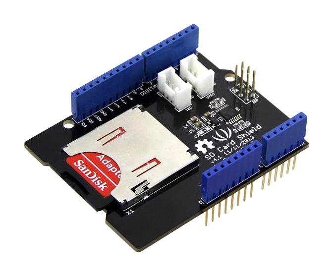 This SD card shield allows you to read and write to an SD card via Arduino's built-in SD library and occupying only the SPI port of your Arduino. It features a MicroSD card adaptor to enable use in the standard SD card slot.