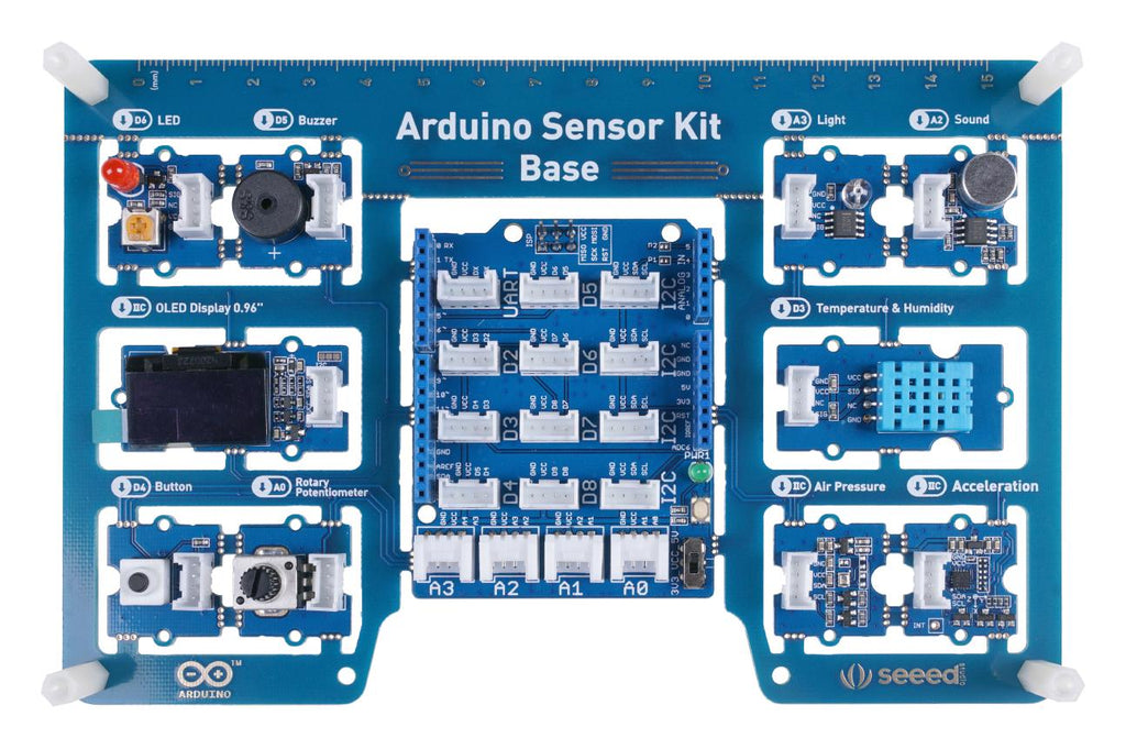 Arduino sensor kit - base is a joint electronics starter kit from Seeed and Arduino. It integrates 10 commonly used electronics modules on one PCB, so no breadboard, no soldering, and even no wiring are required. The Arduino content team has also prepared a step-by-step tutorial for this kit. All these features make it an ideal Arduino starter kit for Steam education and online teaching.