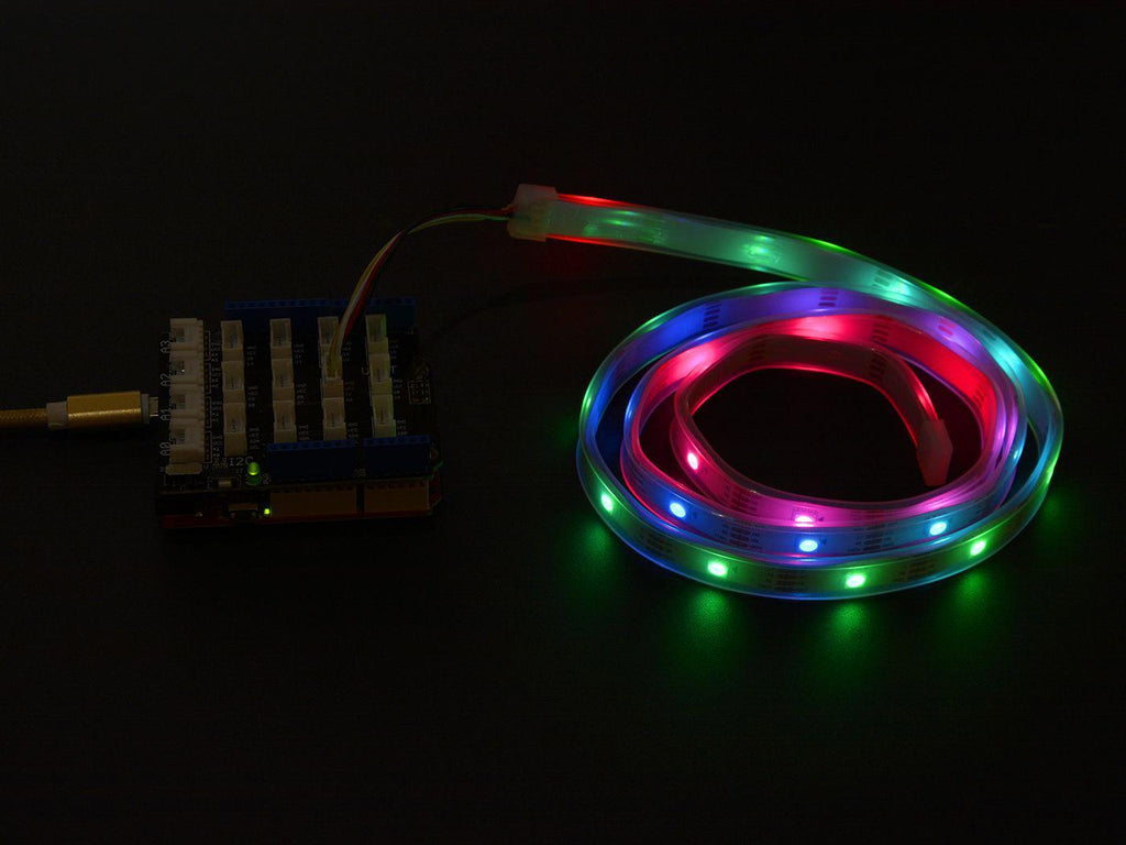 Grove - WS2813 RGB LED Strip Waterproof is a Grove compatible LED strip. It can be lighted by Grove interface. RGB WS2813 is widely used in LED, it can change many colours and is programmable. So you can use it to build many shining project.