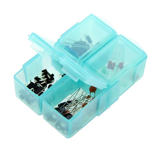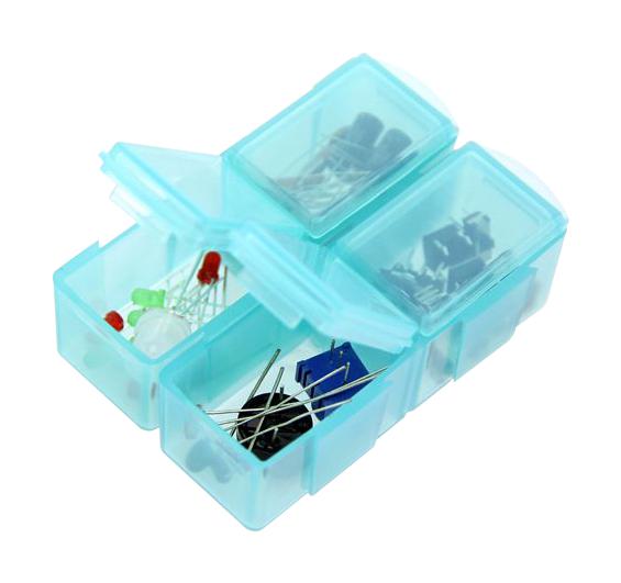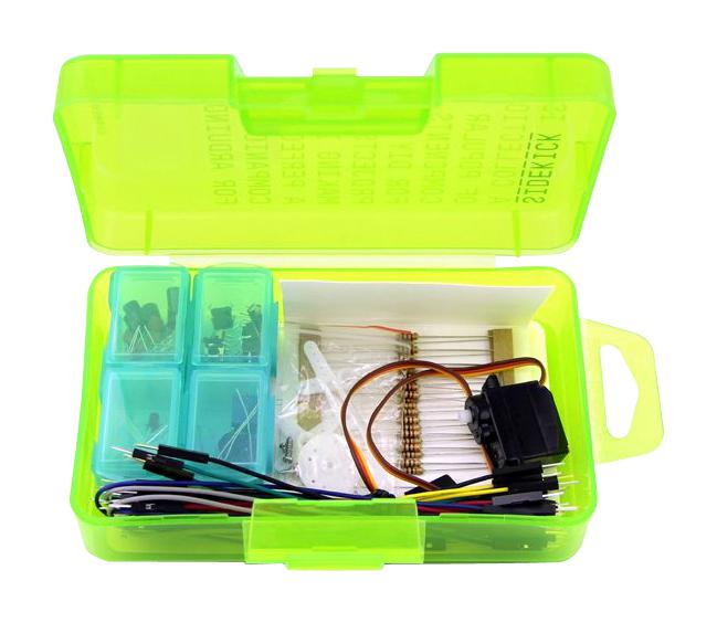 Breadboard x1, Green LED x5, Red LED x5, RGB common anode LED x1, Ceramic capacitor-10nF x10, Ceramic capacitor-100nF x10, Aluminium capacitor-100uF x5, Resistor - 330R x10, Resistor - 1k x10, Resistor - 10k x10, Tilt switch x1, Thermistor x1, Photo resistor x 1, Diode x 1, Buzzer x 1, Button x 5, Slide switch x 5, Mini Servo x 1, Potentiometer with knob x1, Breadboard jumper wire x1.