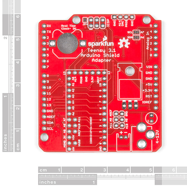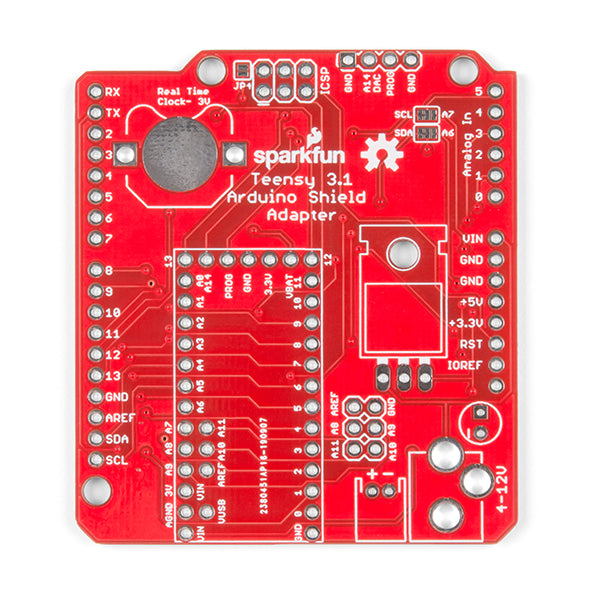 As we stated before, the Teensy Arduino Shield Adapter provides basic Arduino compatibility with your run-of-the-mill shield but there are a few other fun features that we've added on, as well. These features include a Real Time Clock (RTC) battery, a JST battery connector, a 4-12V barrel jack connector, an ICSP header, and more. Because this board is simply an adapter, there is no special programming required to start working with the adapter. You will, however, need to program the Teensy for any Arduino shield you�d like to work with.