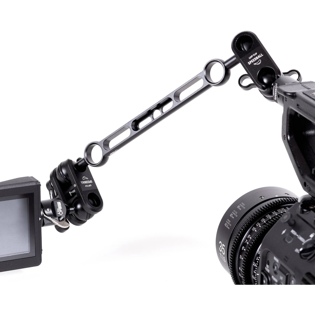 This 9" long Universal Speedball Monitor Arm from MID49 provides two articulating points and allows you to easily yet securely position a monitor or other accessory. The system is compatible with the MID49 1" ball attachment system, as well as any third-party 1" ball system, such as Wooden Camera, Ultralight systems, and others. Each ball end contains both mounting thread standards, 3/8"-16 and 1/4"-20. To access the 1/4"-20, you push the 3/8"-16 outer thread down to reveal the hidden 1/4"-20 screw. The clamp design allows for easy installation, and the spring-loaded locking T-Bar can be pulled out and repositioned for tightening or loosening.