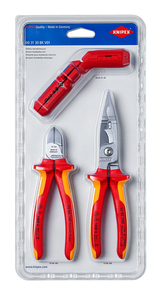 16 95 01 SB KNIPEX ErgoStrip® universal stripping tool, 13 86 200 pliers for electrical installation, 70 06 160 diagonal cutter.