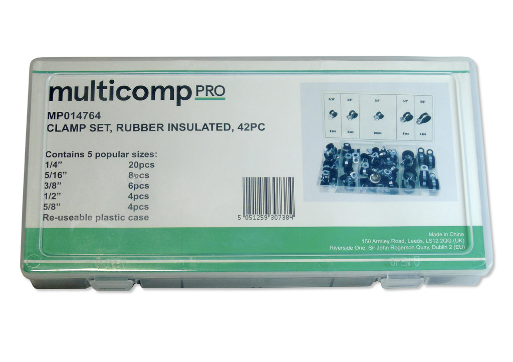 MP014764 is the 42-piece Rubber Insulated Clamp Set that is a must-have for any toolkit! It includes five of the most commonly used sizes: 1/4", 5/16", 3/8", 1/2", and 5/8". These clamps are neatly organized in a re-sealable plastic case, making it a convenient and efficient solution for all your clamping needs.