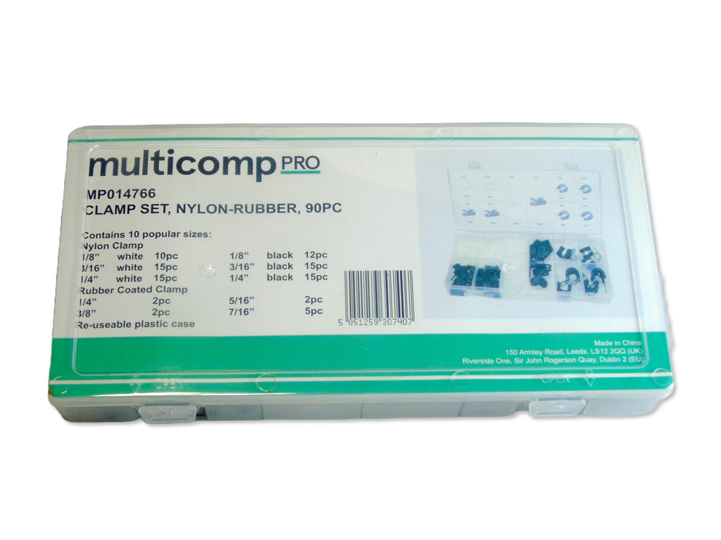 Nylon clamps : 1/8� white (10pcs), 1/8� black (12pcs), 3/16� white (15pcs), 3/16� black (15pcs), 1/4� white (15pcs), 1/4� black (15pcs), Rubber coated clamps : 1/4� (2pcs), 5/16� (2pcs), 3/8� (2pcs), 7/16� (2pcs).