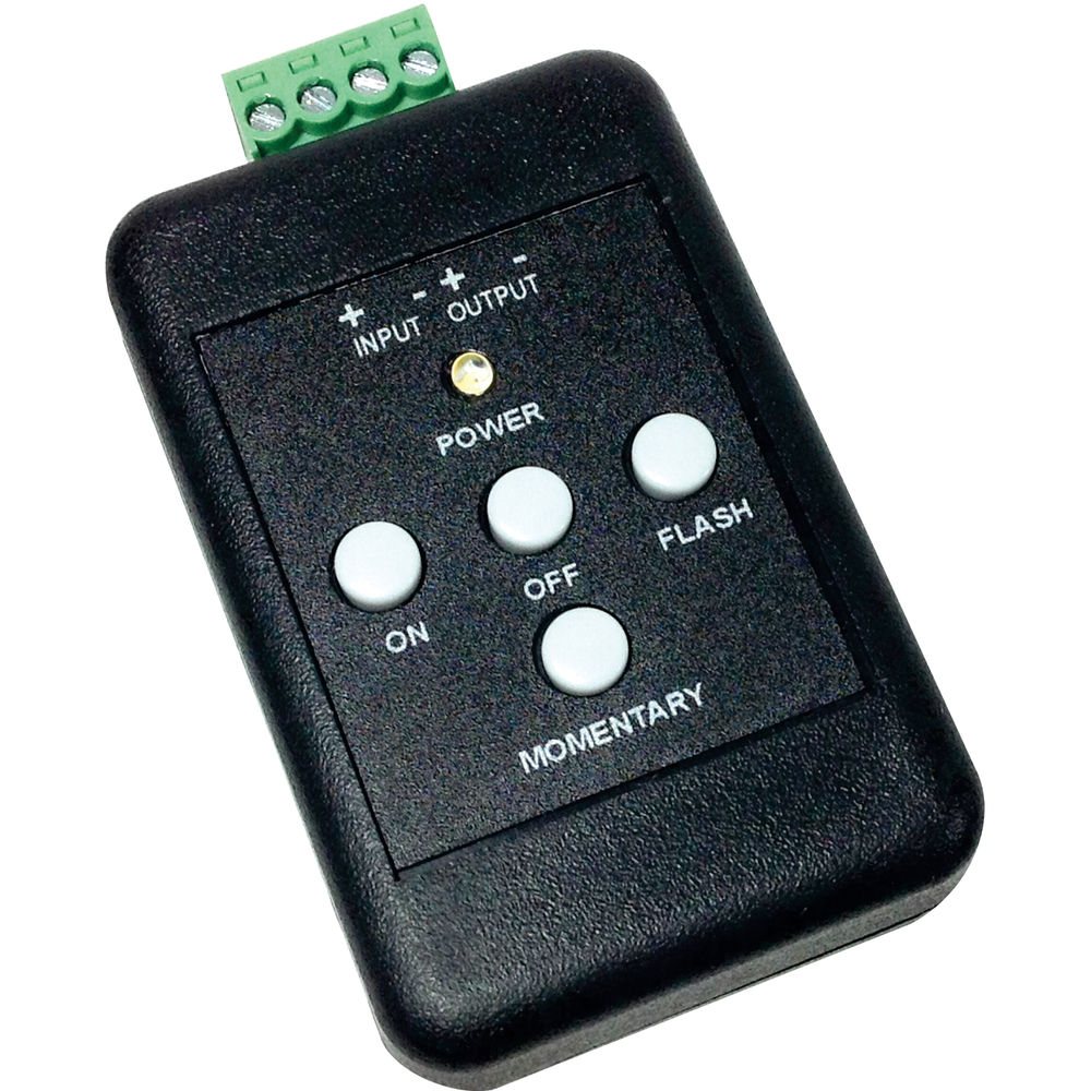 The 4-Button Mini Control Switch from American Recorder is designed to control OAS series LED indicator signs and features a compact case that fits in the palm of your hand. It has a LED status indicator and four control buttons including on, off, flash, and momentary.