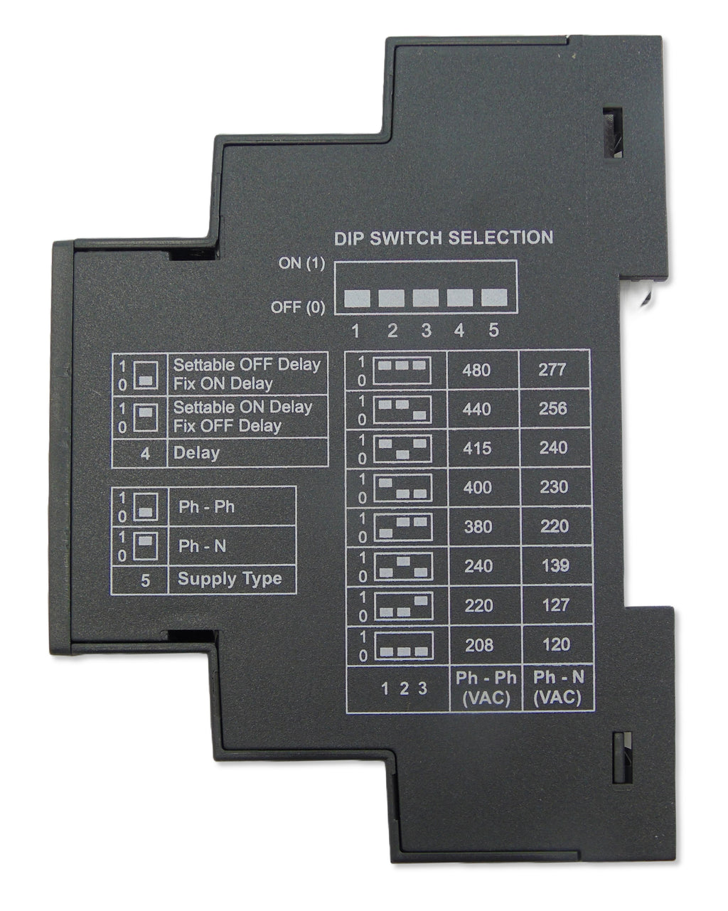 MP008397 product is a phase failure relay which can be used for both a 3 or 4 wire application, switchable by a DIP switch. The supply voltage can also be selected between 208-480V AC by 3 wire and 120-277V AC by 4 wire. This versatile product comes with phase loss, reversal and asymmetry as well as adjustable under and over voltage set points. The on/off time delays are also adjustable with range of 0.5 to 15s using selectable DIP switch, making it a benchmark in its segment. All of this comes in a compact 17.5mm IP40 protected housing making the product an essential tool for your needs.