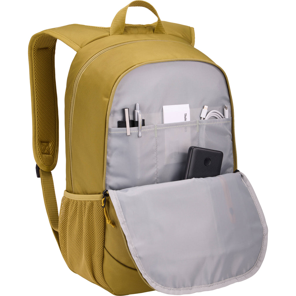 The Case Logic Jaunt Backpack for 15.6" Laptop in dim gold provides a sleek solution for city-dwellers looking to efficiently pack electronics and daily essentials. Fitting a laptop up to 15.6", this backpack features a separate sleeve for a tablet. The front pocket stores your phone, wallet, and ID for quick access, and the interior cable storage pocket keeps accessories organized. Mesh side pockets hold water bottles or other gear. The Jaunt Backpack utilizes GRS-certified, 100% recycled polyester and recycled dobby materials for a socially responsible design.