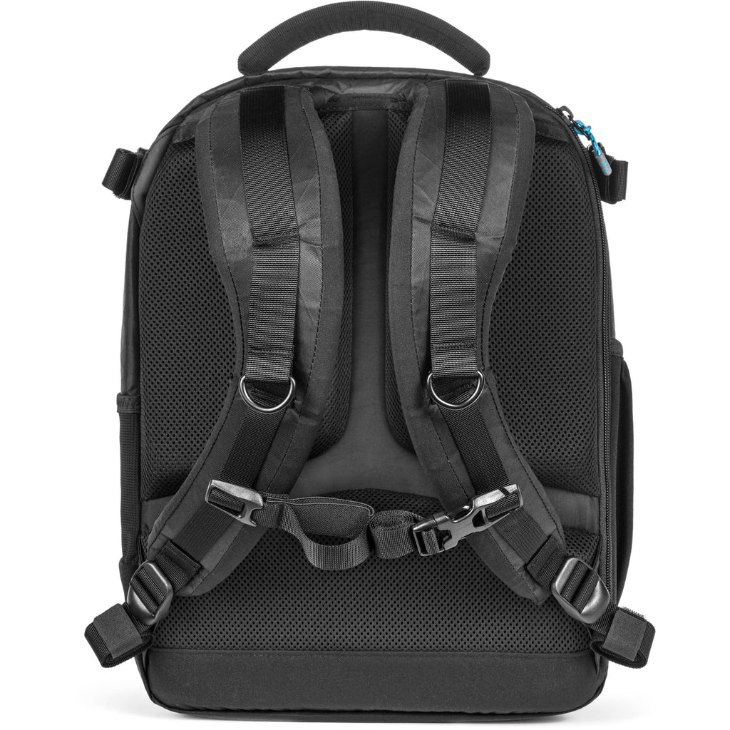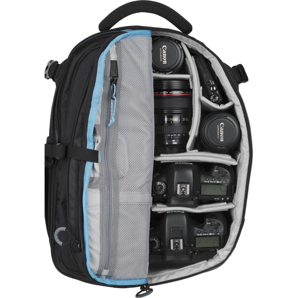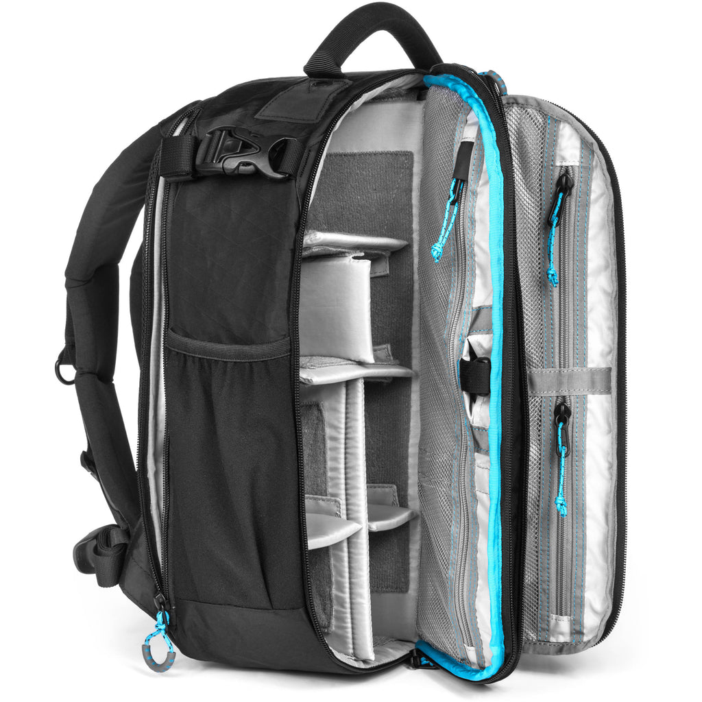 A pair of side-by-side, front-facing zippered panels which fold open toward the center of the backpack provide individual access to the camera compartments. Together, a zippered mesh organizer pocket along the inside of each panel creates space for hard drives, portable batteries, camera filters, or small electronics within the camera compartments. Each panel also features an outer flap that can be unzipped and opened toward the center of the backpack, even when the panels remain closed, revealing two additional organizer pockets for items that need be accessed quickly and conveniently without exposing the contents of the camera compartments.