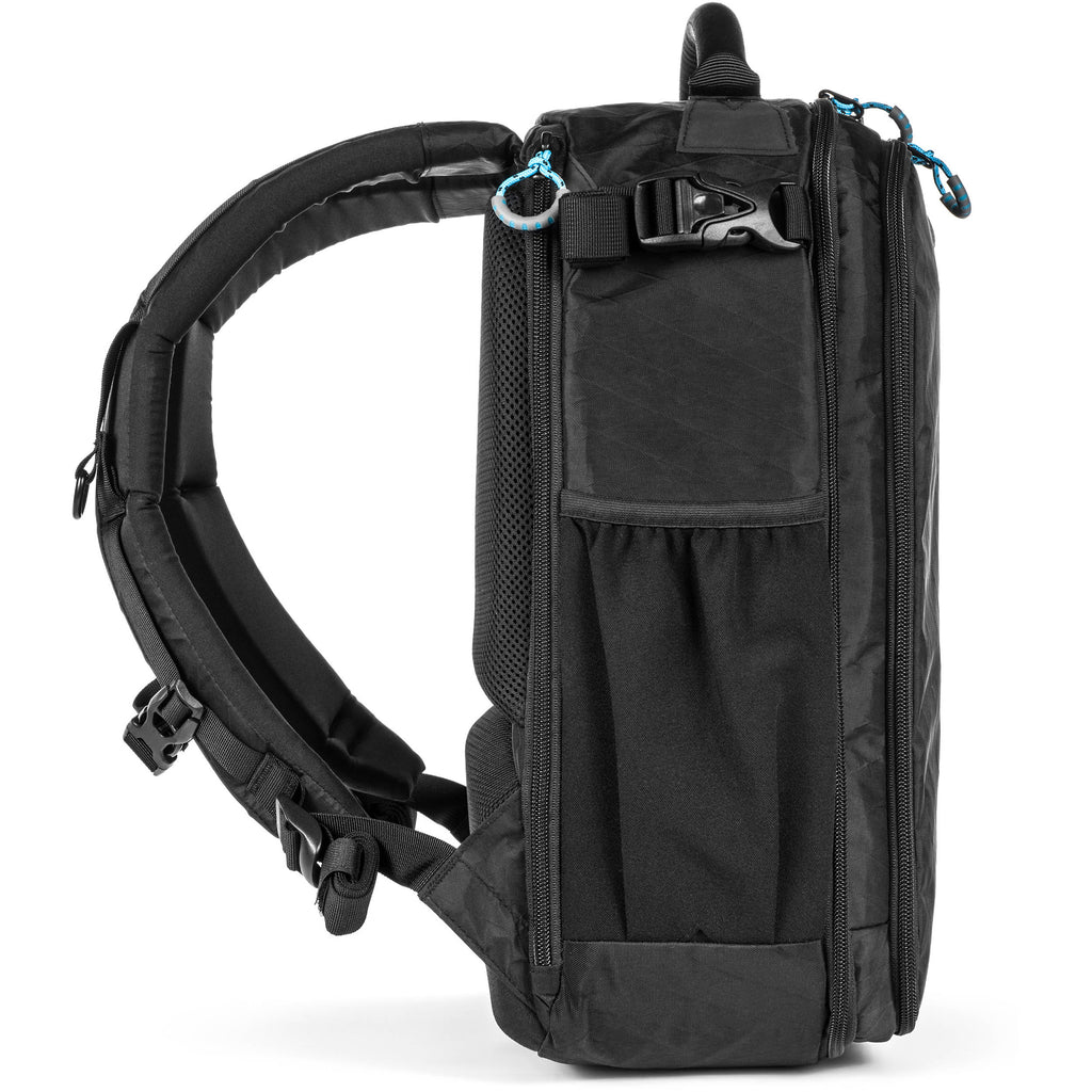 The Kiboko 2.0 16L Backpack can be carried using its built-in top handle, or by its adjustable, padded shoulder straps as the resilient and breathable 3D mesh padding along the outside rear surface cushions the wearer's back and shoulders. The padding's elevated structure optimizes air circulation, minimizing perspiration in warm and hot environments. For heavy loads, the adjustable sternum strap can be used to more evenly distribute the weight being carried. When the Kiboko 2.0 16L Backpack is worn, a dedicated, zippered compartment for a 13" laptop or tablet computer rests directly behind the shoulders, while along both sides of the backpack are two large, stretchable pockets with side-compression straps that can each hold and secure a water bottle. Alternatively, the pockets can be used to hold a tripod, monopod, or trekking pole; each can be further secured using the side-compression strap located above the pocket.