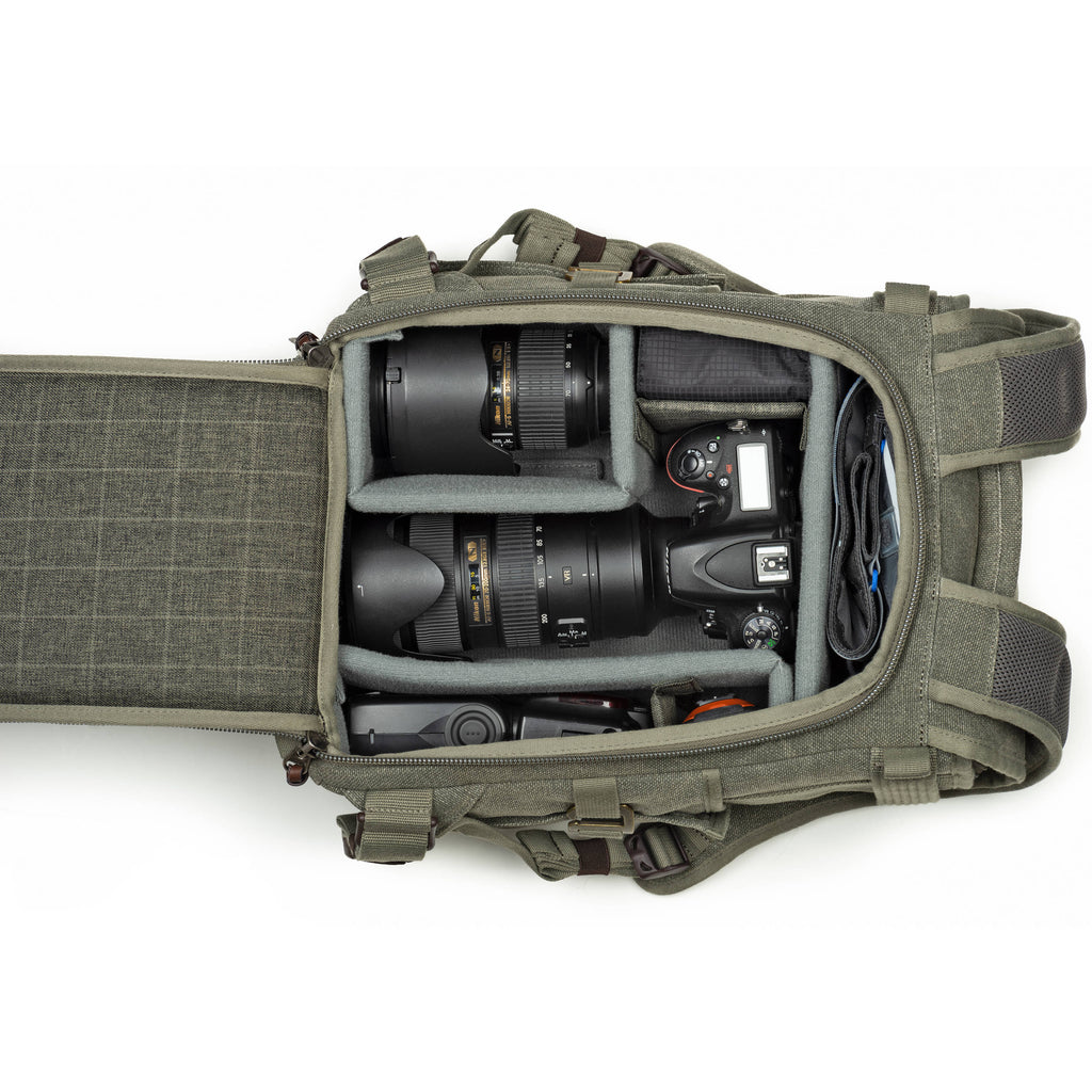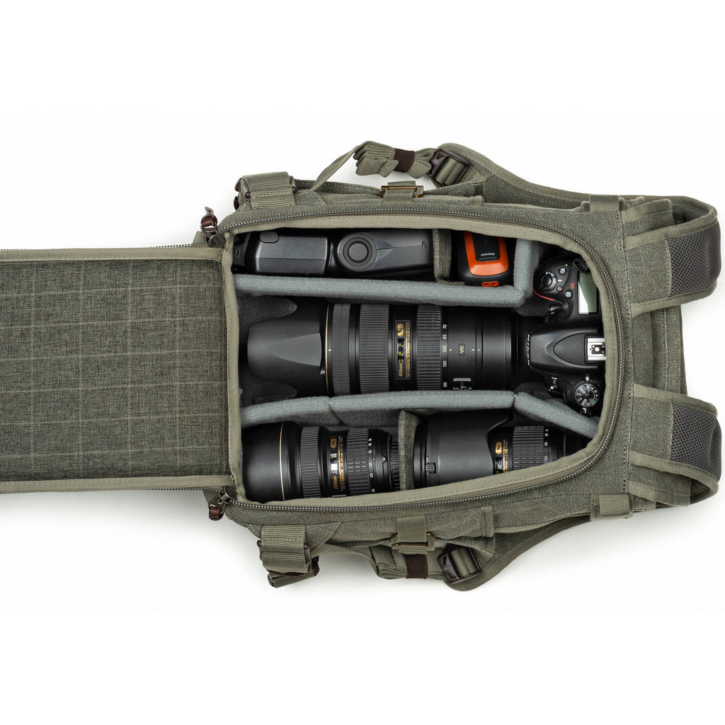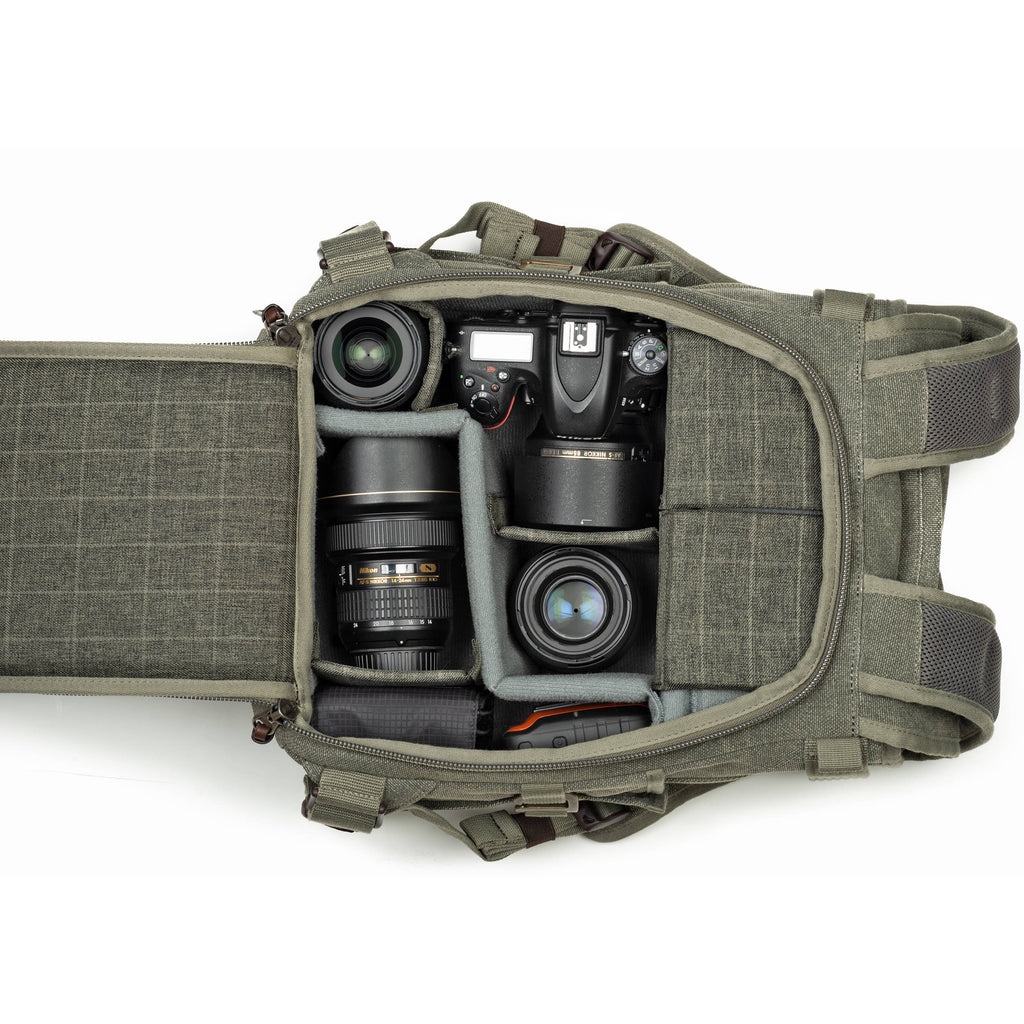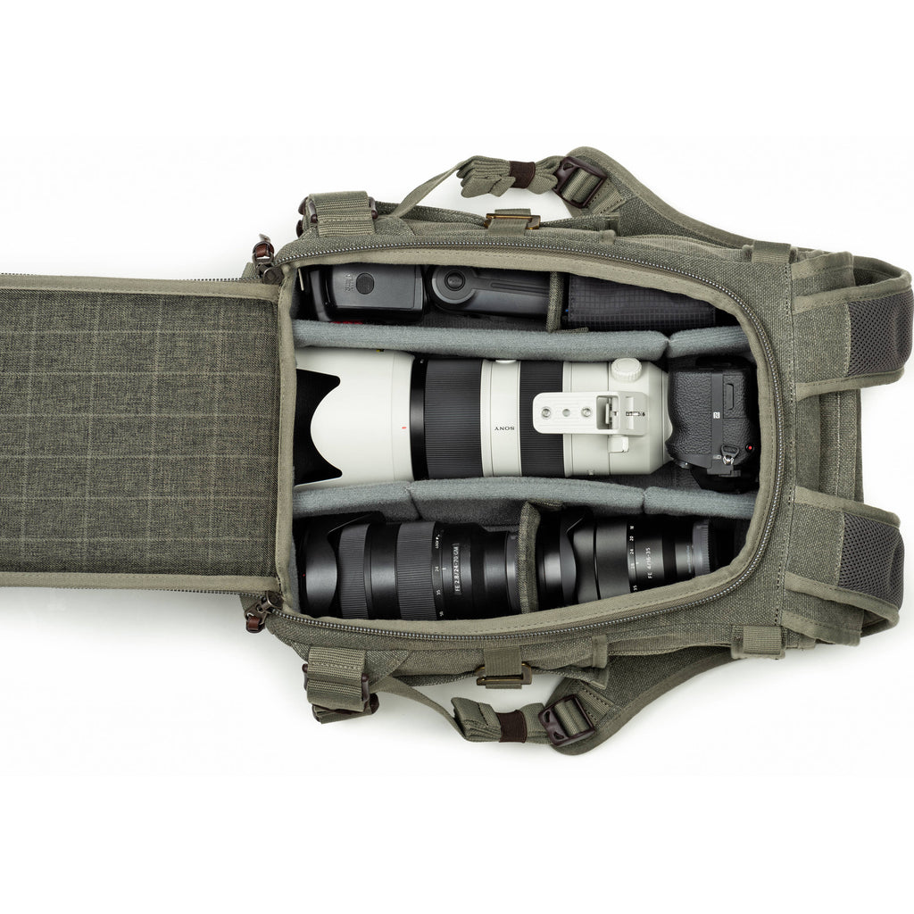 The pinestone soft canvas Retrospective Backpack 15L from Think Tank Photo has a 15L main compartment designed to hold a mirrorless or DSLR camera with a 70-200mm lens attached, plus four additional lenses, and a flash. The dividers in the main compartment can be reconfigured to accommodate different setups. All your camera equipment is accessible through the backpack's rear and top panels, and the dedicated laptop pocket will hold most 15" laptops. The 5-liter top compartment can be used to store personal articles and there is additional space in the front organizer pocket for your wallet, smartphone, or pens. The wide comfortable backpack straps have an adjustable sternum strap, and a removable webbing waist belt to take some of the weight off your shoulders.