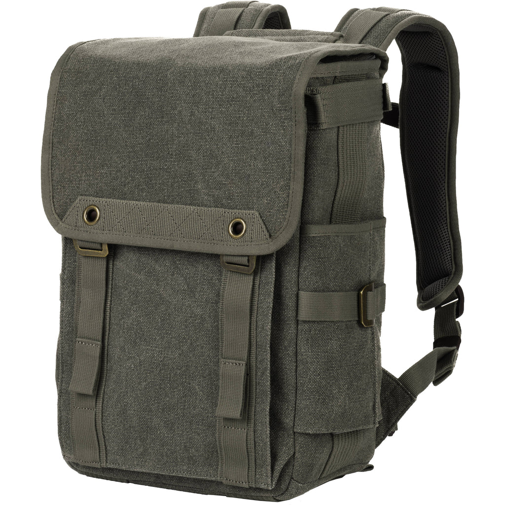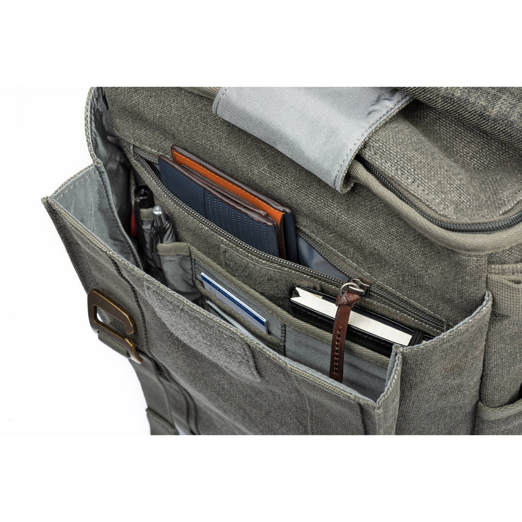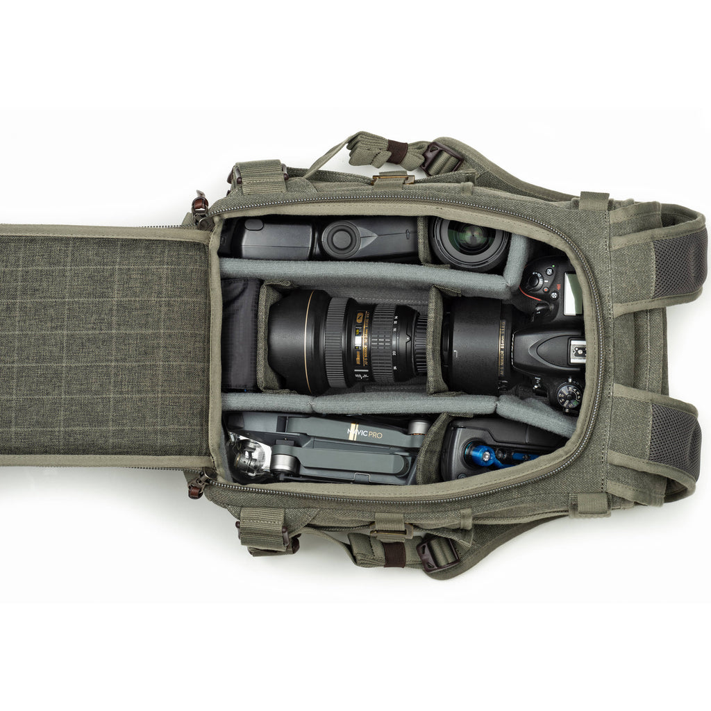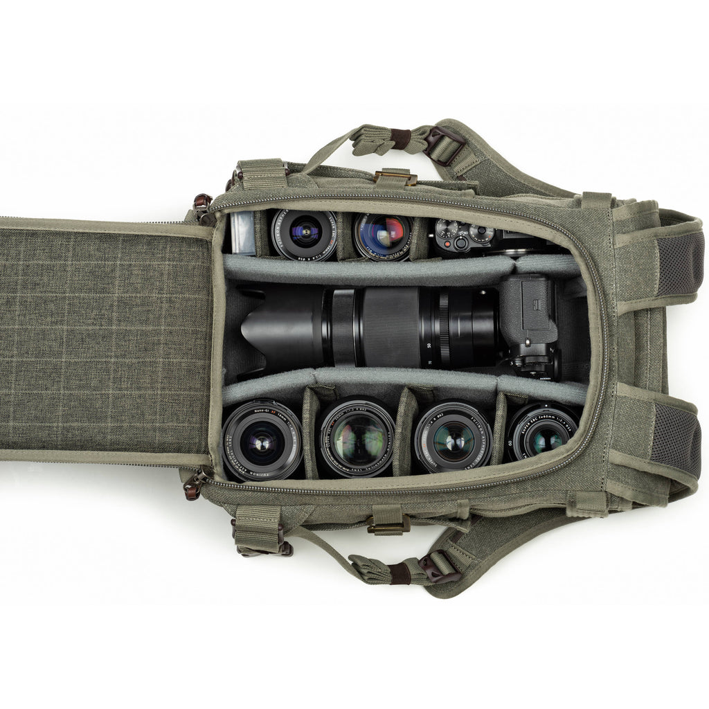 The pinestone soft canvas Retrospective Backpack 15L from Think Tank Photo has a 15L main compartment designed to hold a mirrorless or DSLR camera with a 70-200mm lens attached, plus four additional lenses, and a flash. The dividers in the main compartment can be reconfigured to accommodate different setups. All your camera equipment is accessible through the backpack's rear and top panels, and the dedicated laptop pocket will hold most 15" laptops. The 5-liter top compartment can be used to store personal articles and there is additional space in the front organizer pocket for your wallet, smartphone, or pens. The wide comfortable backpack straps have an adjustable sternum strap, and a removable webbing waist belt to take some of the weight off your shoulders.