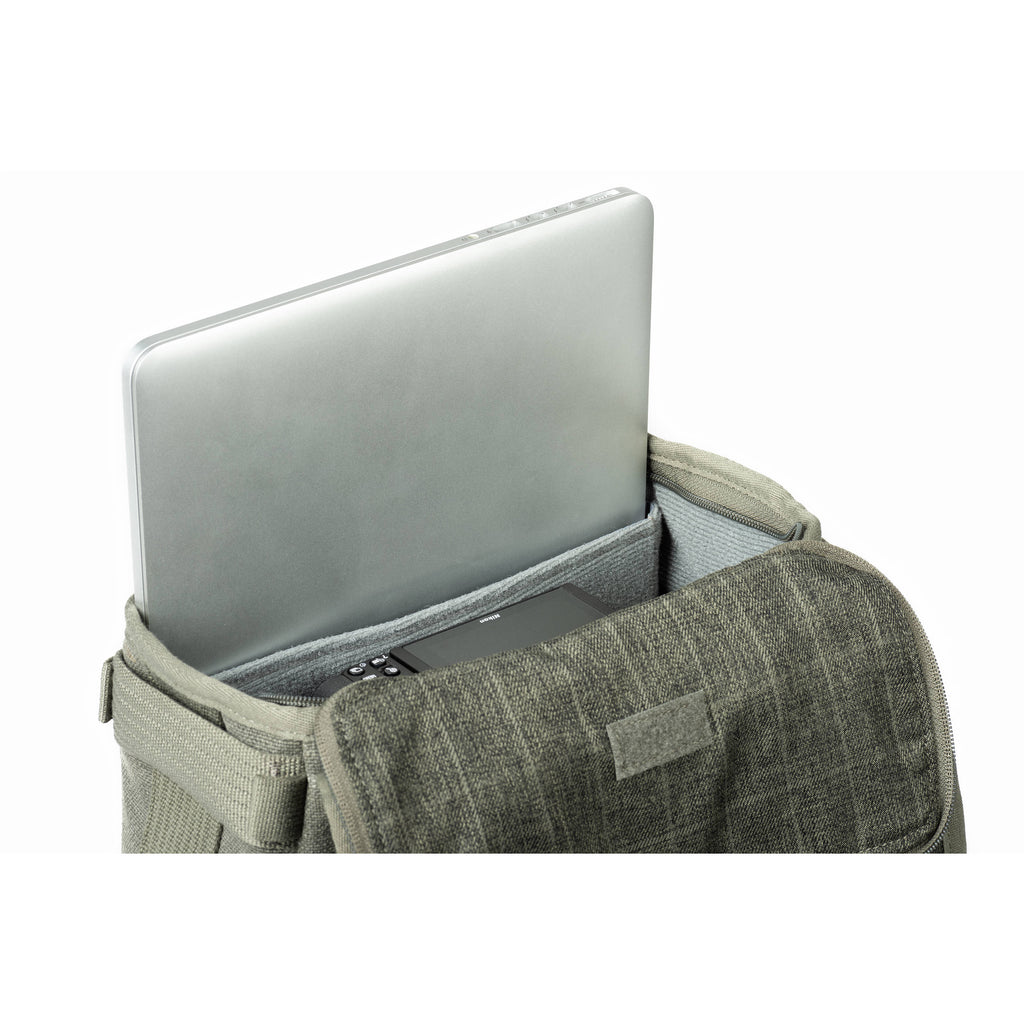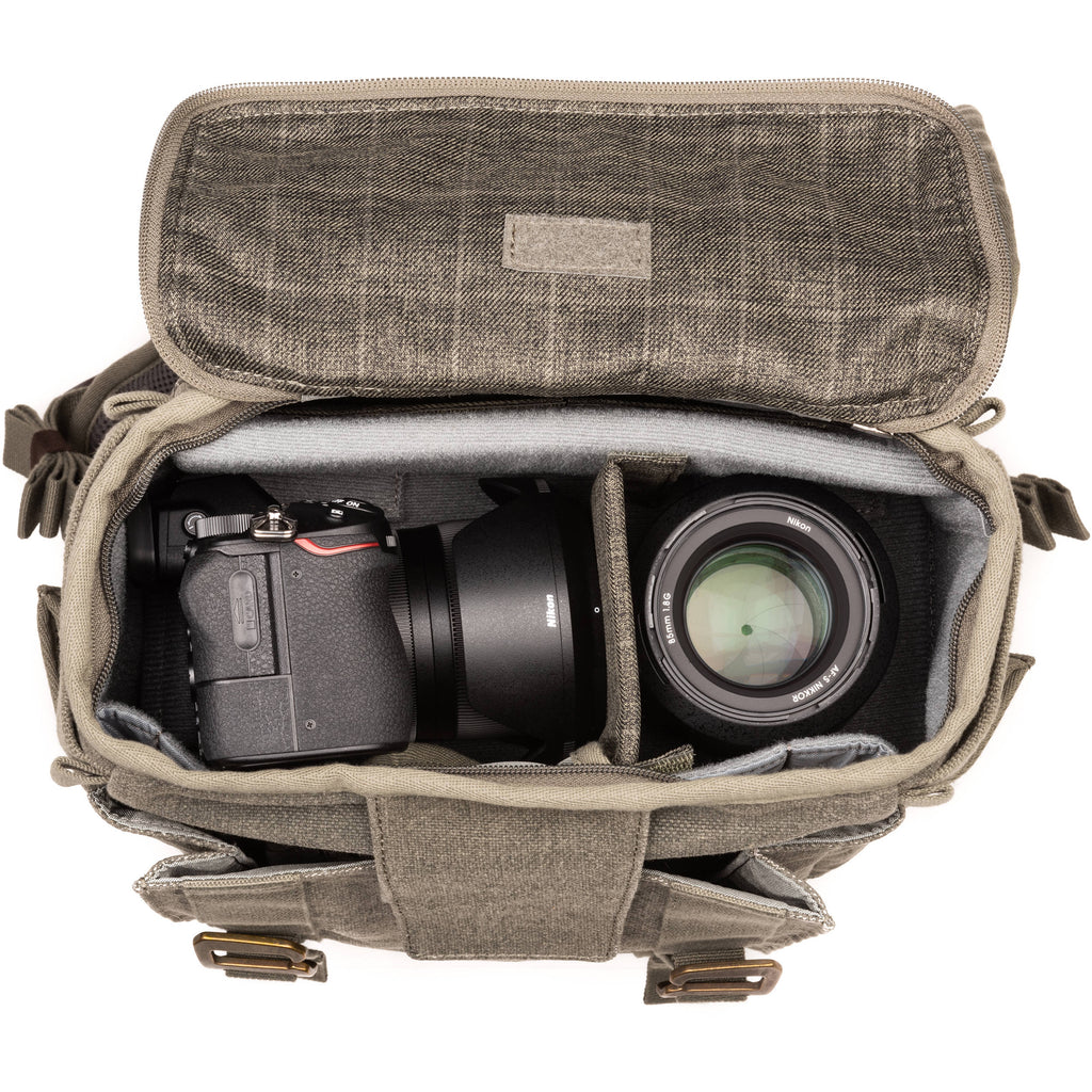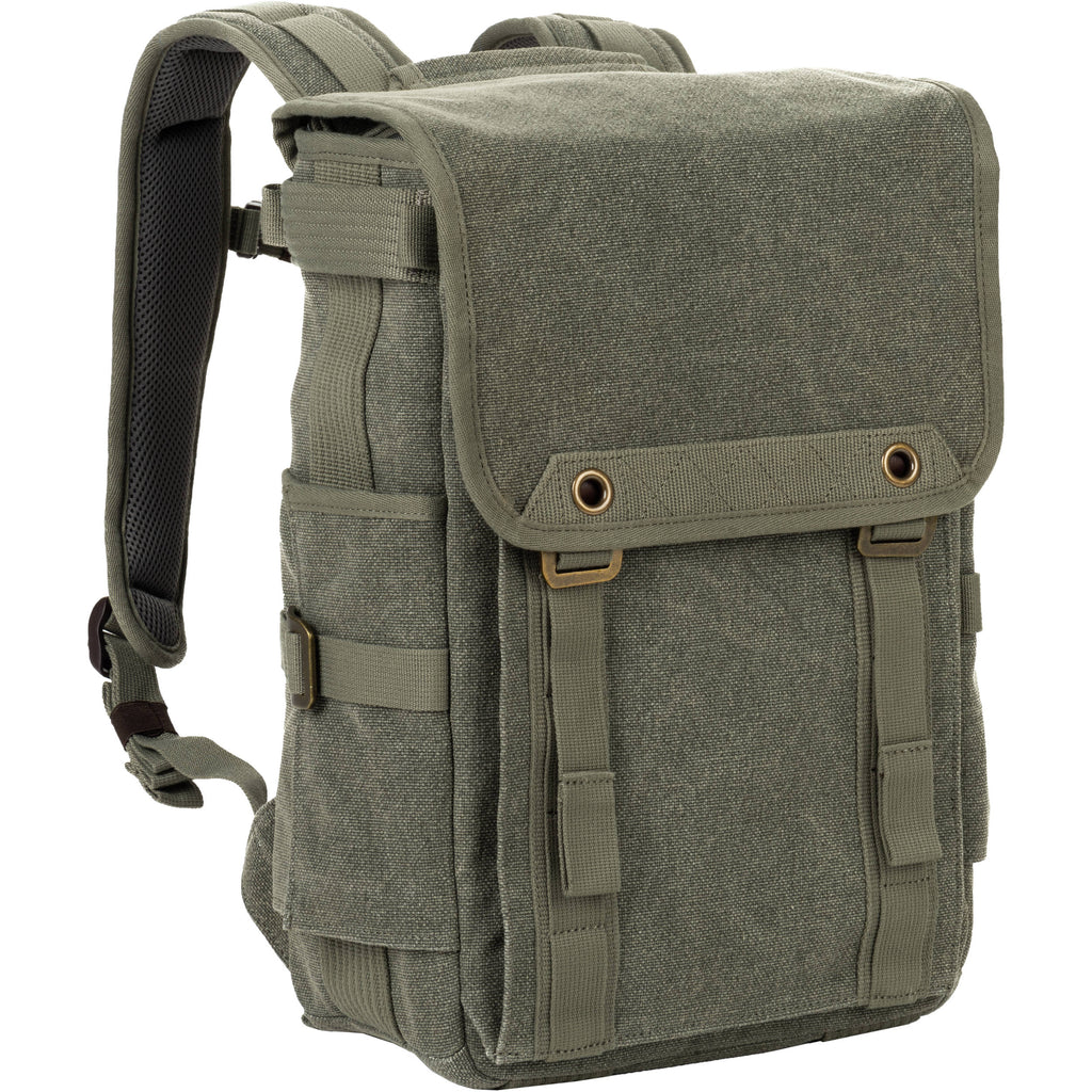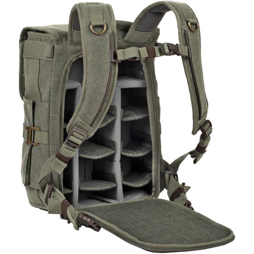 The pinestone soft canvas Retrospective Backpack 15L from Think Tank Photo has a 15L main compartment designed to hold a mirrorless or DSLR camera with a 70-200mm lens attached, plus four additional lenses, and a flash. The dividers in the main compartment can be reconfigured to accommodate different setups. All your camera equipment is accessible through the backpack's rear and top panels, and the dedicated laptop pocket will hold most 15" laptops. The 5-liter top compartment can be used to store personal articles and there is additional space in the front organizer pocket for your wallet, smartphone, or pens. The wide comfortable backpack straps have an adjustable sternum strap, and a removable webbing waist belt to take some of the weight off your shoulders.
