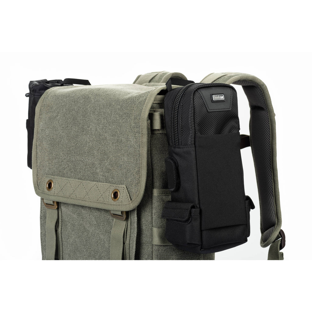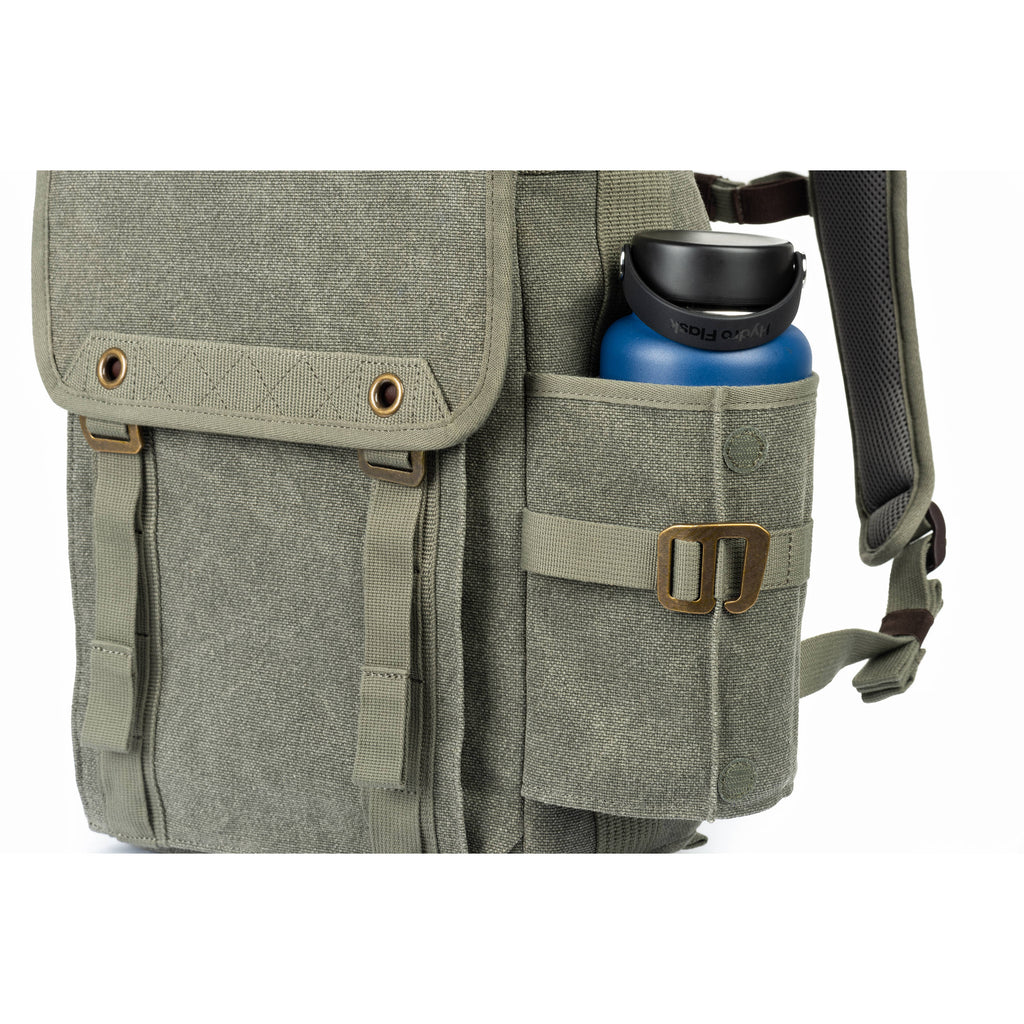 The exterior of the bag is equipped with accessory straps that are compatible with Think Tank's modular pouches. Collapsible water bottle pockets on each side of the bag hold a water bottle or a tripod, or the tripod can attach to the front panel. The canvas of the bag has been treated to repel water, and a rain cover is included for those days when there is a heavy downpour. Both top and rear panels close via its YKK zippers.