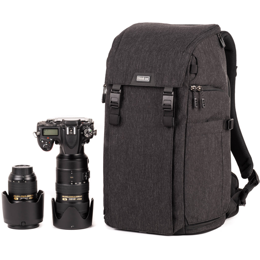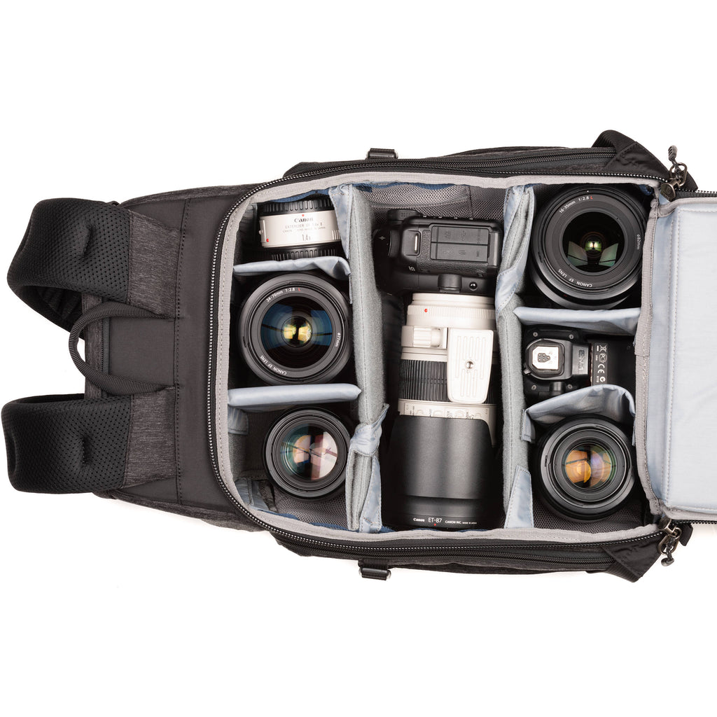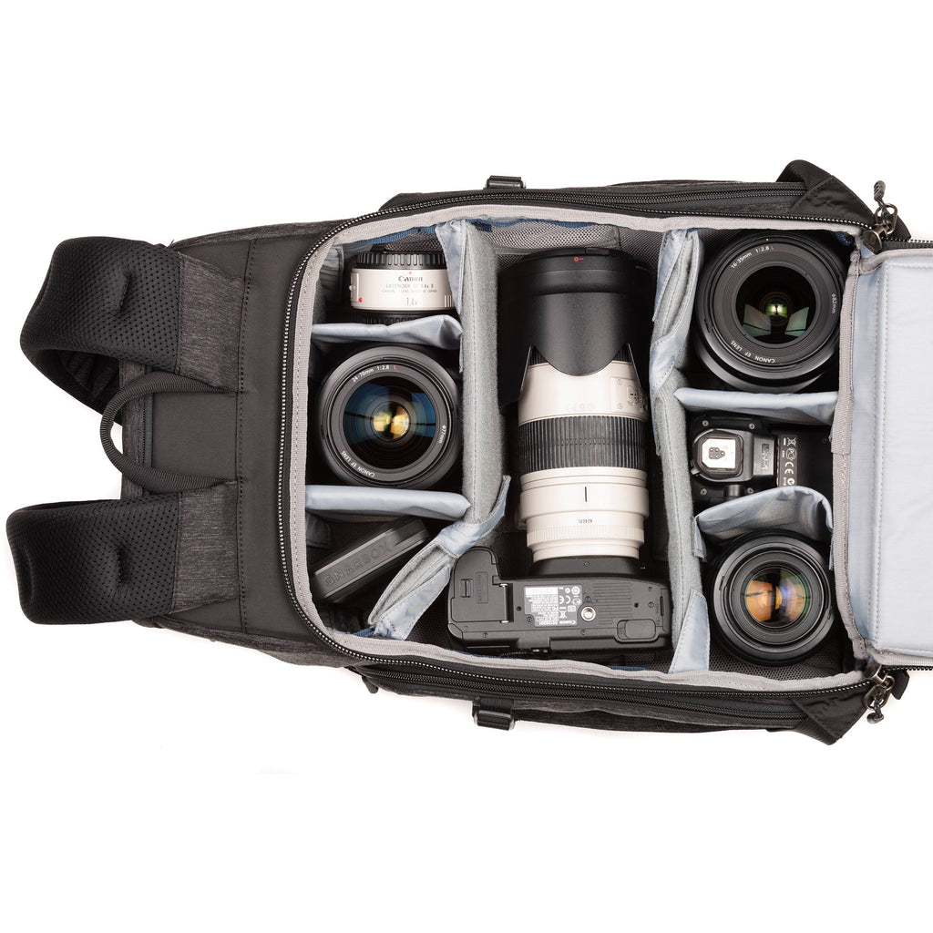 This black Urban Access 15 Backpack from Think Tank is a versatile camera bag with a spacious main compartment that can accommodate a DSLR or mirrorless camera with an attached 70-200mm f/2.8 lens, six to seven additional lenses, and a shoe mount flash.