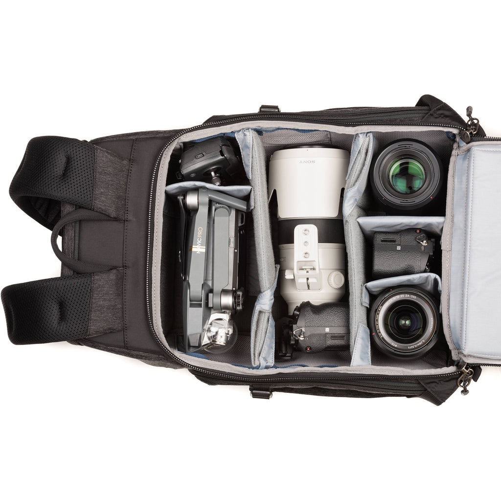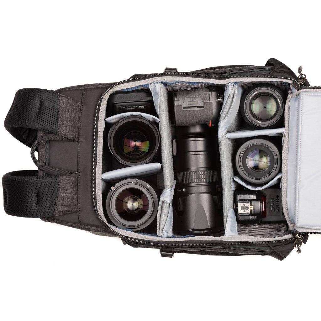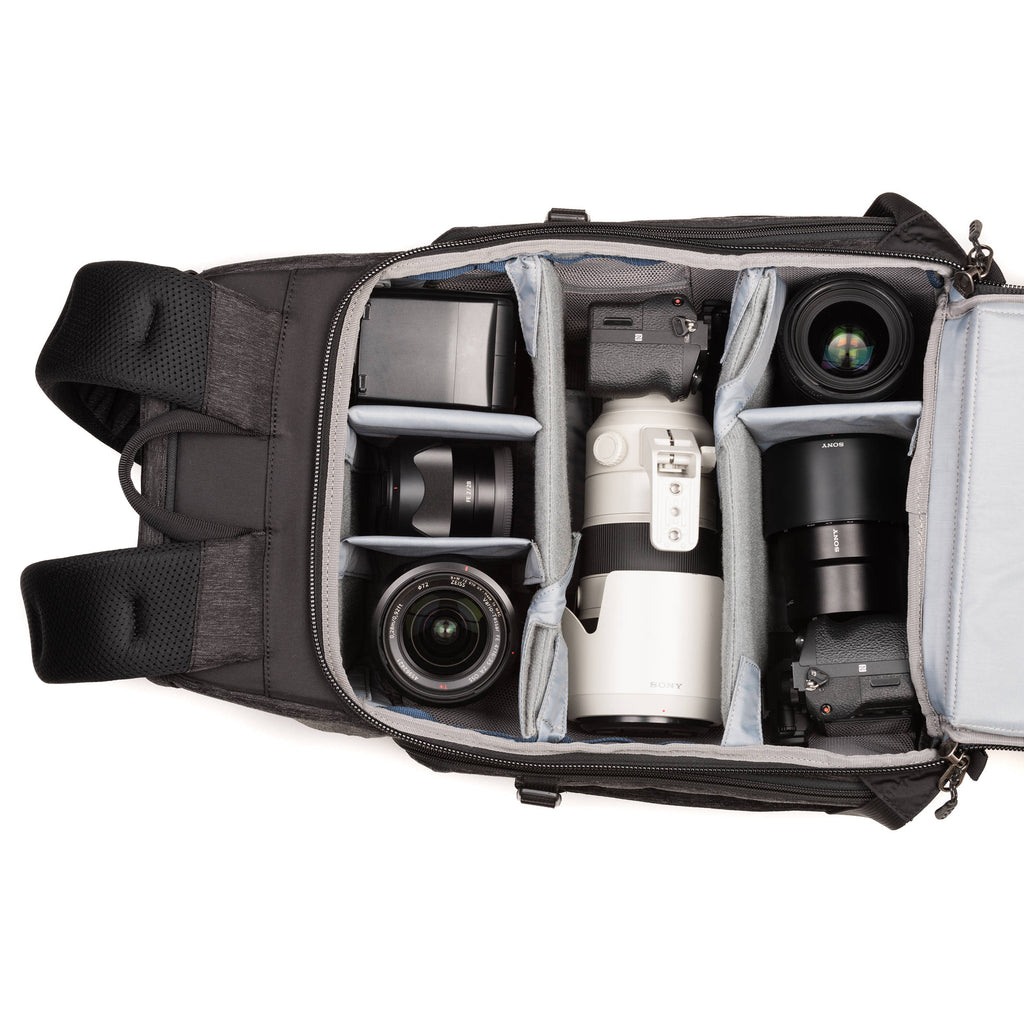 This black Urban Access 15 Backpack from Think Tank is a versatile camera bag with a spacious main compartment that can accommodate a DSLR or mirrorless camera with an attached 70-200mm f/2.8 lens, six to seven additional lenses, and a shoe mount flash.