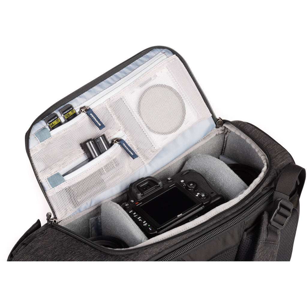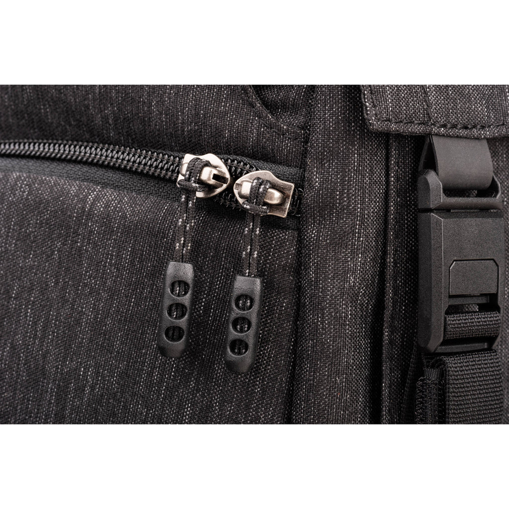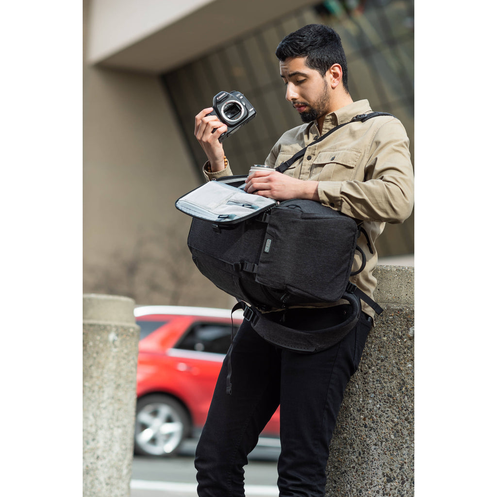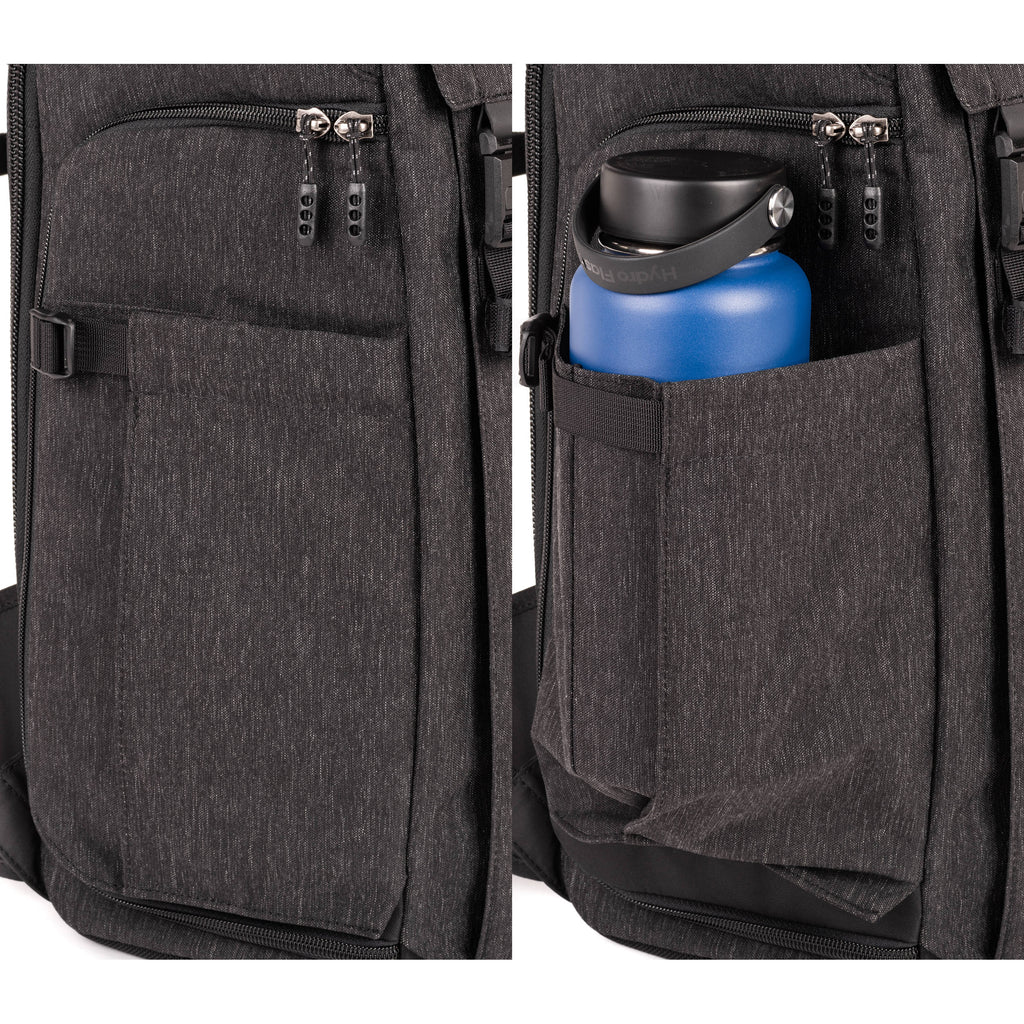Complete access to the main compartment and its seven removable dividers is provided by a rear-facing zippered panel that opens 180° downward to also reveal a 15" laptop sleeve with a retaining tab. A zippered panel also allows items along the wearer's left side to be reached. By rotating the Urban Access 15 Backpack from one's back to front with its left side facing upward, the wearer can open this bag without having to fully remove it. Inside that panel, three zippered, mesh organizational pockets can be used to store and organize camera batteries, memory cards, or small electronics. An additional zipped panel along the wearer's right side opens to reveal one large zippered, mesh organizational pocket while along the exterior of each zippered side panel is a large, open pocket that can hold a 1L water bottle. To secure any item placed inside them, webbing straps are integrated within each pocket's rim.