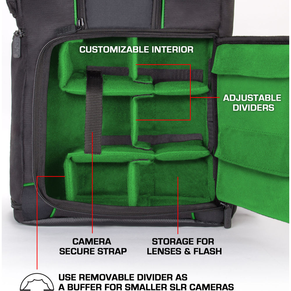 Store and protect your DSLR camera, lenses and accessories in the green USA Gear S17 DSLR Camera Backpack from Accessory Power . Touch-fastening padded dividers and eight accessory pockets provide numerous customized storage options. The top of the pack has a zippered compartment with an accessory pocket for keeping personal items and anything requiring handy access. A padded laptop compartment will accommodate a 15.6" notebook, tablet or other similar sized device.