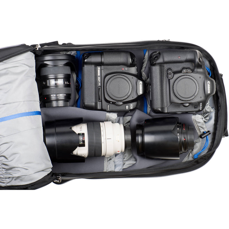 | Materials | Exterior : Water-repellent DWR coated fabric, with polyurethane coating on the underside 600D Twill YKK RC zippers 320 g Dry-flow air mesh Nylon webbing Three-ply bonded nylon thread Interior : Removable closed-cell foam dividers Polyurethane backed liner and dividers 200D Polyester Laminated non-woven backed Nylex liner 2x Polyurethane coated nylon 190T Seam-sealed taffeta rain cover Three-ply bonded nylon thread |