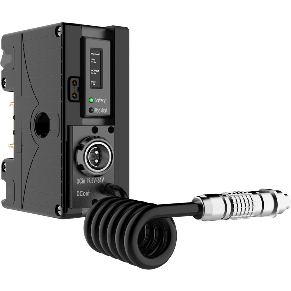 It provides 11 to 34 VDC battery input and output and inputs 19.5 to 34 VDC via its 2-pin Fischer connector to provide power failover. There is also a D-Tap output that provides 11 to 17V to power your camera or accessories as well as a 4-pin LEMO output connector for failover and to power additional equipment. The mount features an LCD screen that shows power voltage and percentage information as well as total power draw.