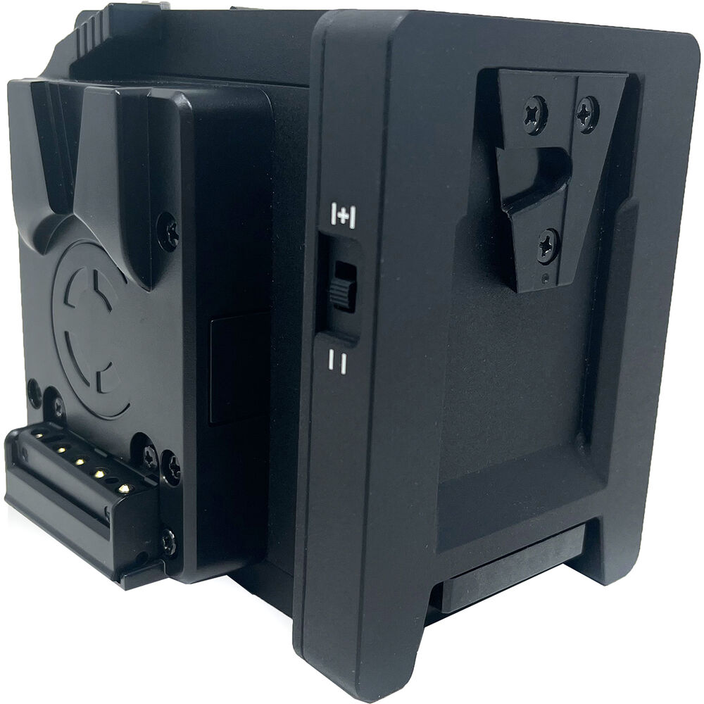 The batteries can power the camera by discharging at the same time, or you can choose to discharge them one at a time and use the hot swap function. Since the ports on some cameras such as the RED V-RAPTOR are on the back, to prevent blocking them, the plate can slide away from the back of the camera to make room for your cables to plug in. Each D-Tap and power output to the camera is unregulated 11 to 17 VDC.