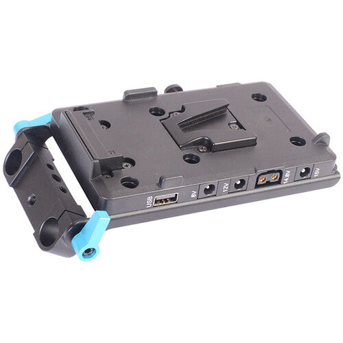 This plate features a 14.8V D-Tap output, a USB output, and 8, 12, and 15V barrel outputs on its side. Its 15mm LWS rod bracket features a tilting design for easier mounting on your camera rig.