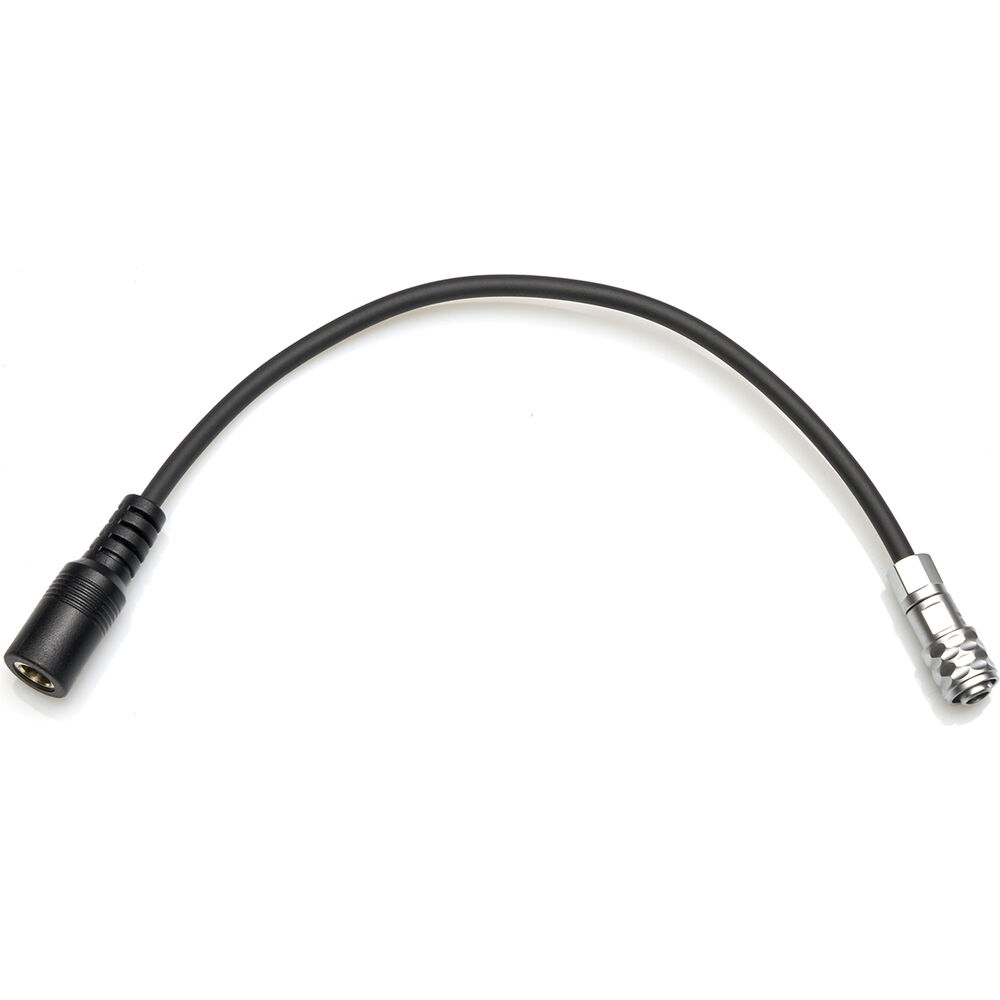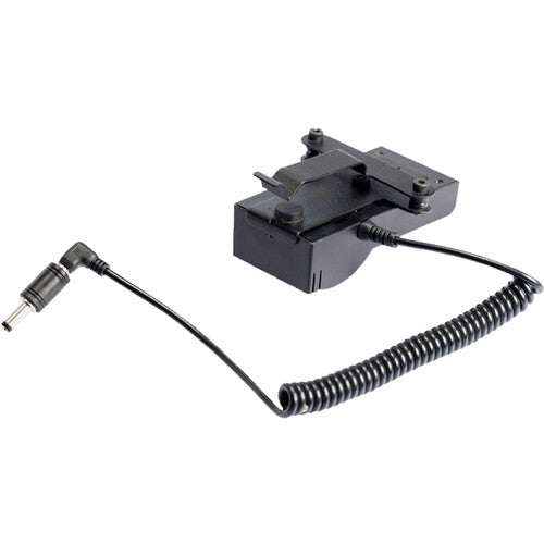 The coiled power cable extends from 19 to 46" in length, and it features a 2.1mm male barrel power connector. The adapter extension features a 2.1mm female barrel connector on one end and a 2-pin LEMO-type connector that plugs into the camera's power port. The unit mounts onto a belt or strap using a belt clip.