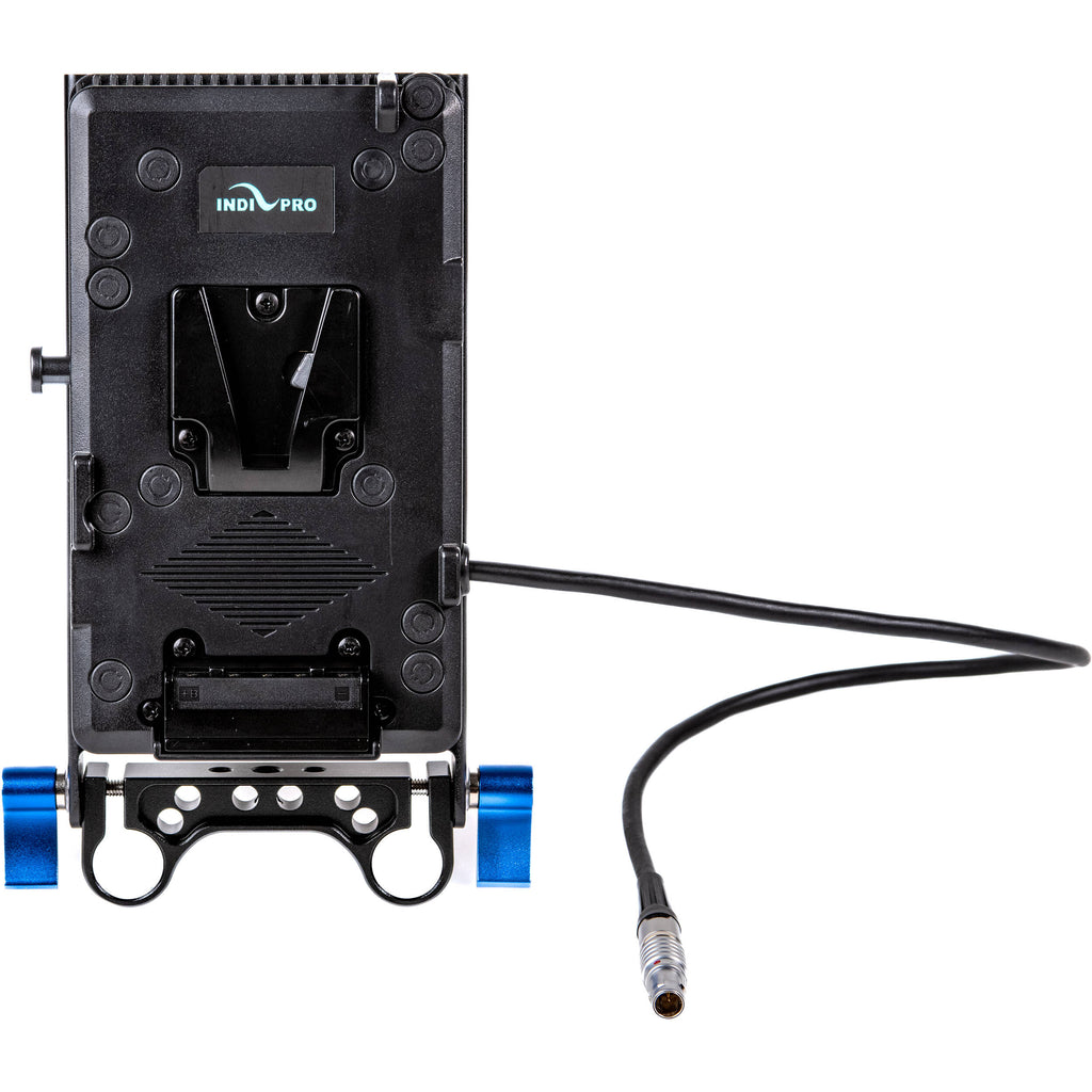 Add long-lasting V-mount battery support to your camera with the dedicated Battery Plate with 15mm LWS Rod Bracket for Blackmagic PYXIS from IndiPRO Tools. This adapter connects to your camera via its 16" cable with a 2-pin LEMO connector and mounts on your rig using its bottom 15mm LWS rod bracket. When mounted on rods on the back of your rig, it can also function as a counterweight. This made-in-the-USA plate also features a D-Tap output for powering a 12-16V accessory simultaneously with the camera.
