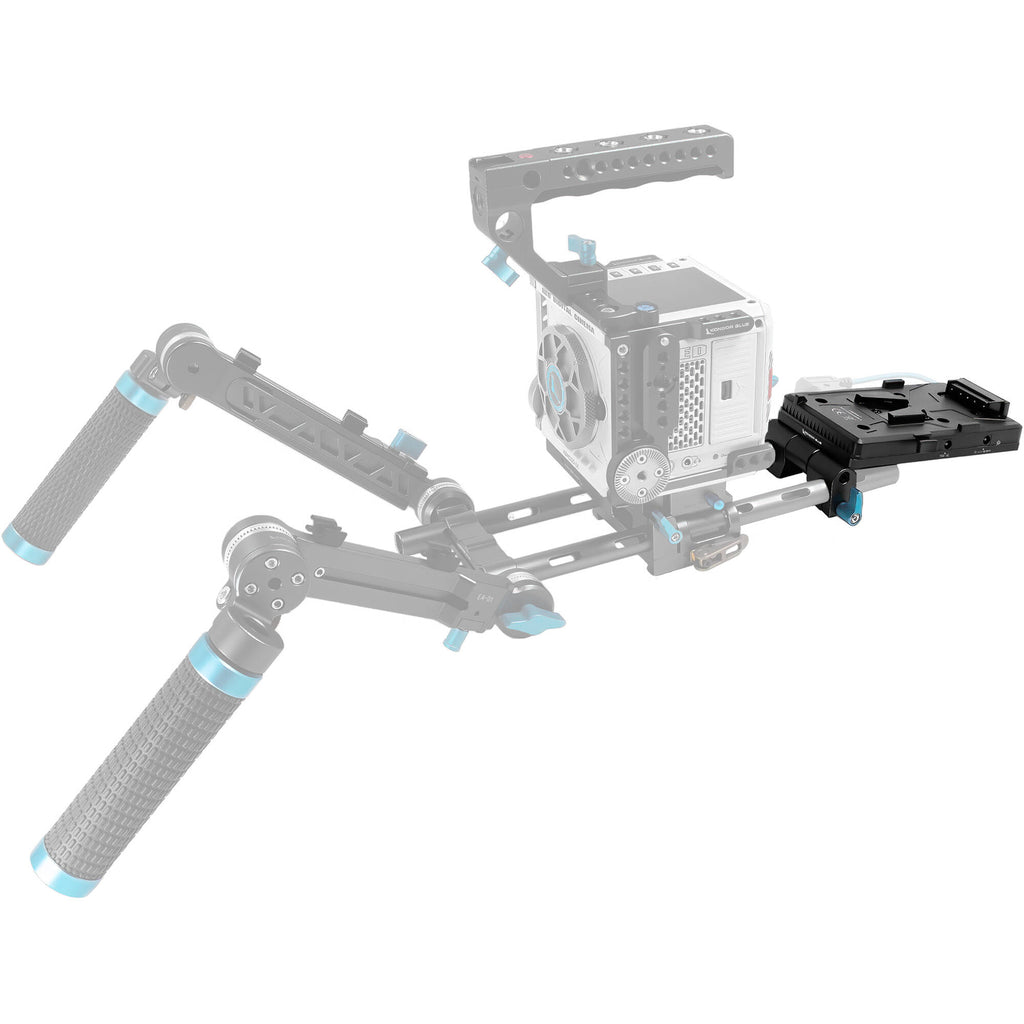 Add professional battery power to your rig with this raven black V-mount Cine Battery Plate from Kondor Blue. The plate attaches to your rig with its built-in 15mm rod clamp and provides multiple DC power output ports for your camera and accessories.