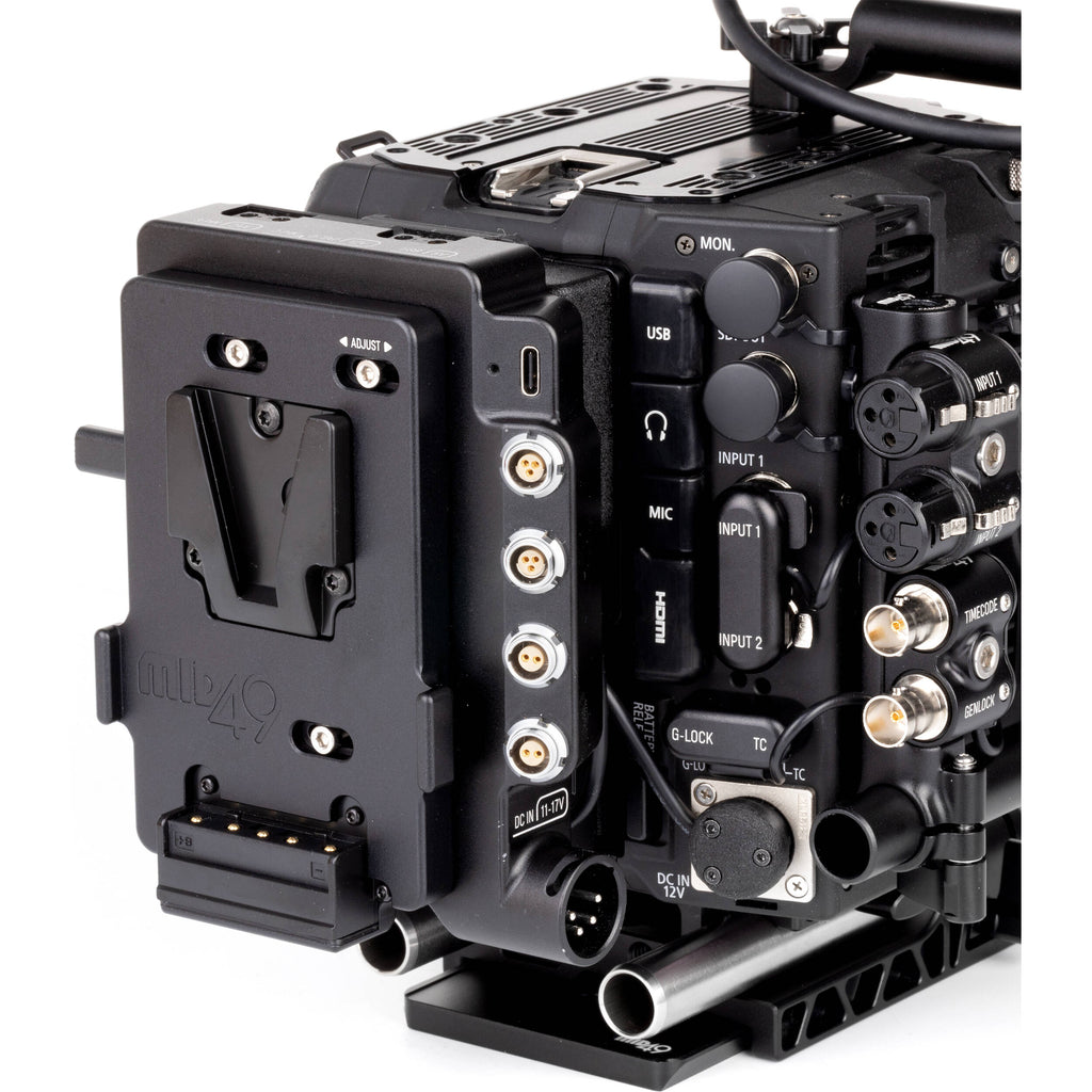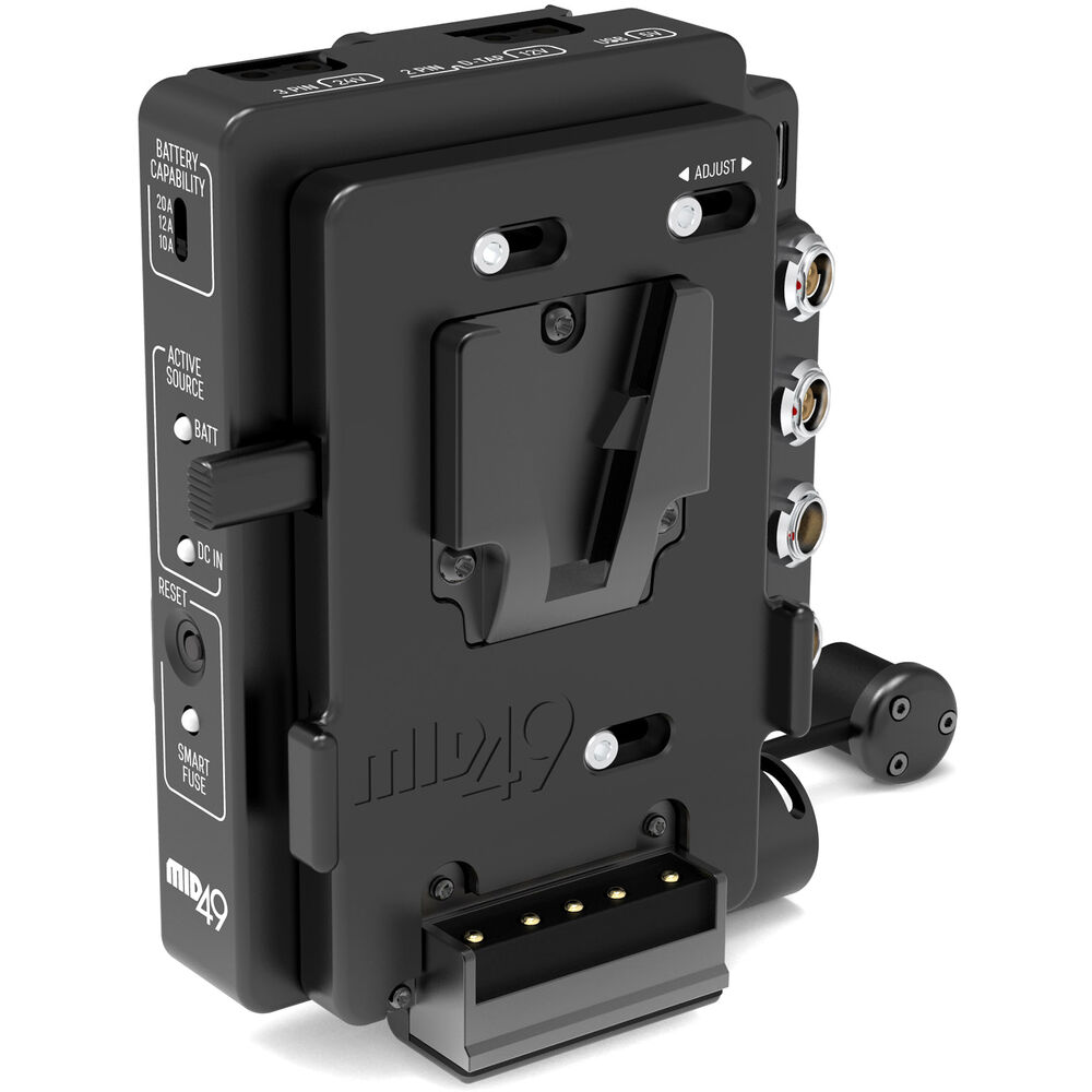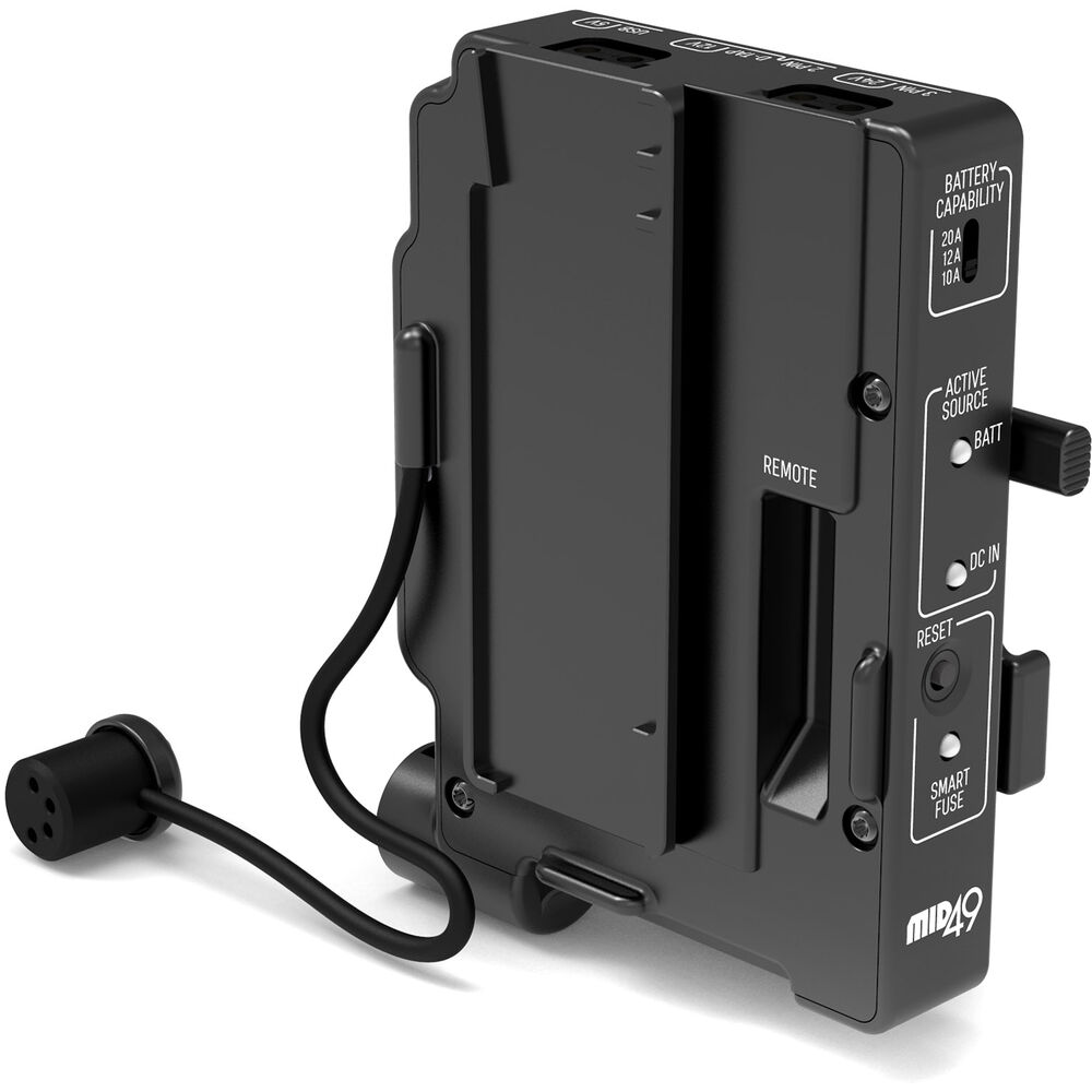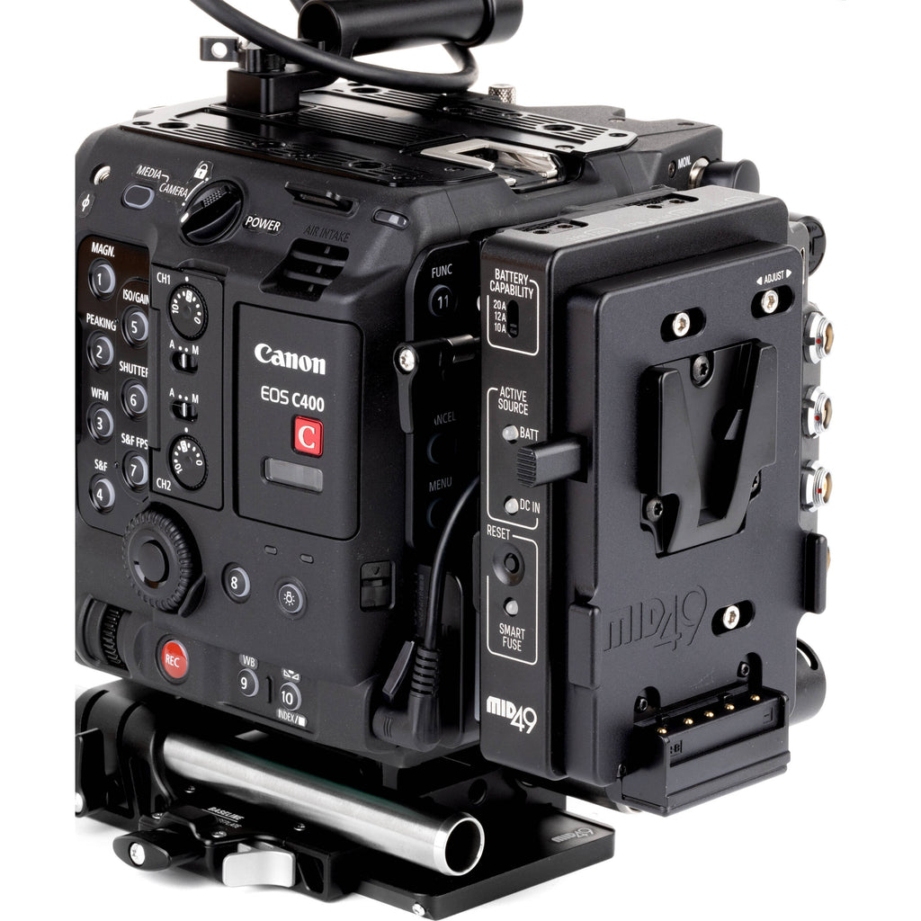 MID49 is an intelligent power solution for your camera that allows you to power your C400 using standard V-mount batteries. It features a 4-pin XLR for an optional power input, which allows you to hot-swap batteries without turning the camera off. A variety of output ports let you safely power accessories without exceeding the capacity of your battery; additionally, the power distribution box features a Smart Fuse system that will shut down power to the accessories should they exceed your battery's capacity to keep your camera running. The box enables you to use a BP-A30N battery as a backup, and it provides remote start/stop.