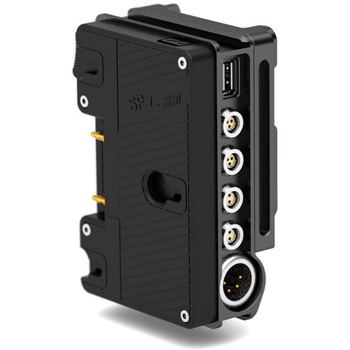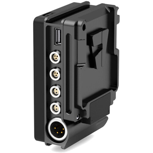 The plate features a 12V 4-pin XLR input to provide redundant power from an external source, and its built-in chip prevents the battery from being discharged when installed. Output options include two 24V 3-pin Fischer run/stop trigger ports, three D-Tap outputs, two 2-pin LEMO-type outputs, and one 3.5V USB-A output for powering accessories.