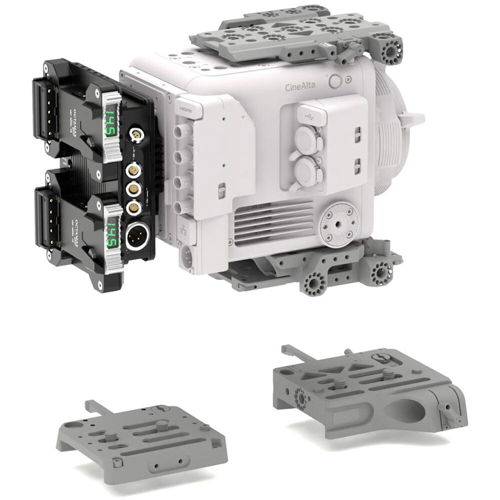 Adapt your cinema camera or light for use with two full-sized V-mount batteries using this Power Box Pro Dual V-Mount to V-Mount Adapter from OCTAMAS gear. Constructed from lightweight yet durable aluminum, this versatile power adapter features numerous power options for powering your V-mount camera or production gear using two professional V-mount batteries while providing redundant, hot-swap power and accessory power distribution options. Multiple threads on the top and bottom of the mount provide mounting options to integrate into the OCTAMAS gear SWISS cage system.