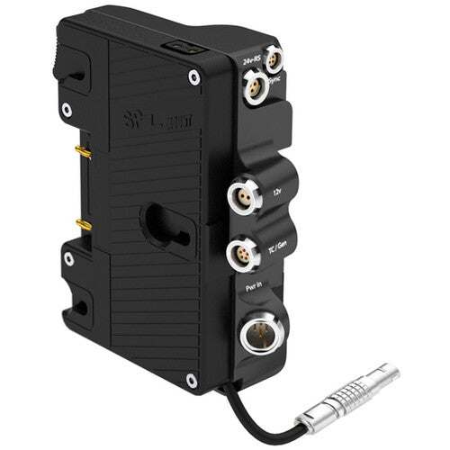 The Power Box Pro I/O Gold Mount from OCTAMAS gear is a power distribution box for a Gold mount battery that mounts directly onto the RED V-RAPTOR V-mount plate to provide power and control distribution. The plate plugs into the 9-pin EXT port on the camera to expand power and control options for the camera, and the 6-pin cable plugs into the camera's power input to provide hot-swap and failover options.