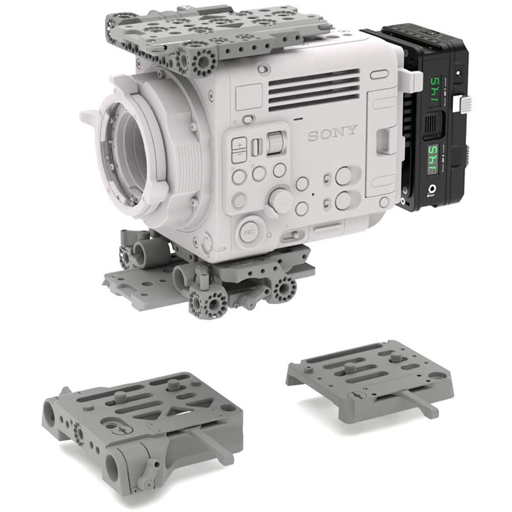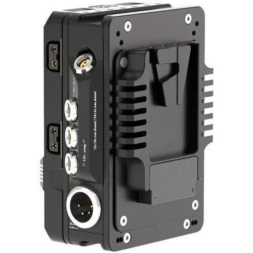 The plate features a 12V 4-pin XLR input to provide redundant power from an external source for hot-swapping with uninterrupted power, and its built-in chip prevents the battery from being discharged when installed. Output options include two 24V 3-pin Fischer run/stop trigger ports, a 3.5mm LANC run/stop trigger port, three D-Tap outputs, and two 2-pin LEMO-type outputs for powering accessories.