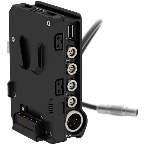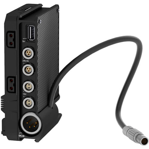 The Power Box V-Mount with RED 6-Pin 12V Camera Cable from OCTAMAS gear is a power distribution box for a V-mount battery that features a 6-pin camera cable output to provide power to a RED camera with a 6-pin input, such as the RED V-RAPTOR. It also features a 12V 4-pin XLR input that supports failover.