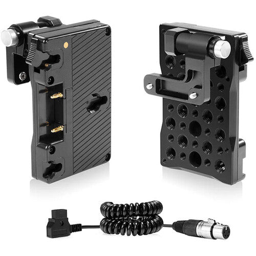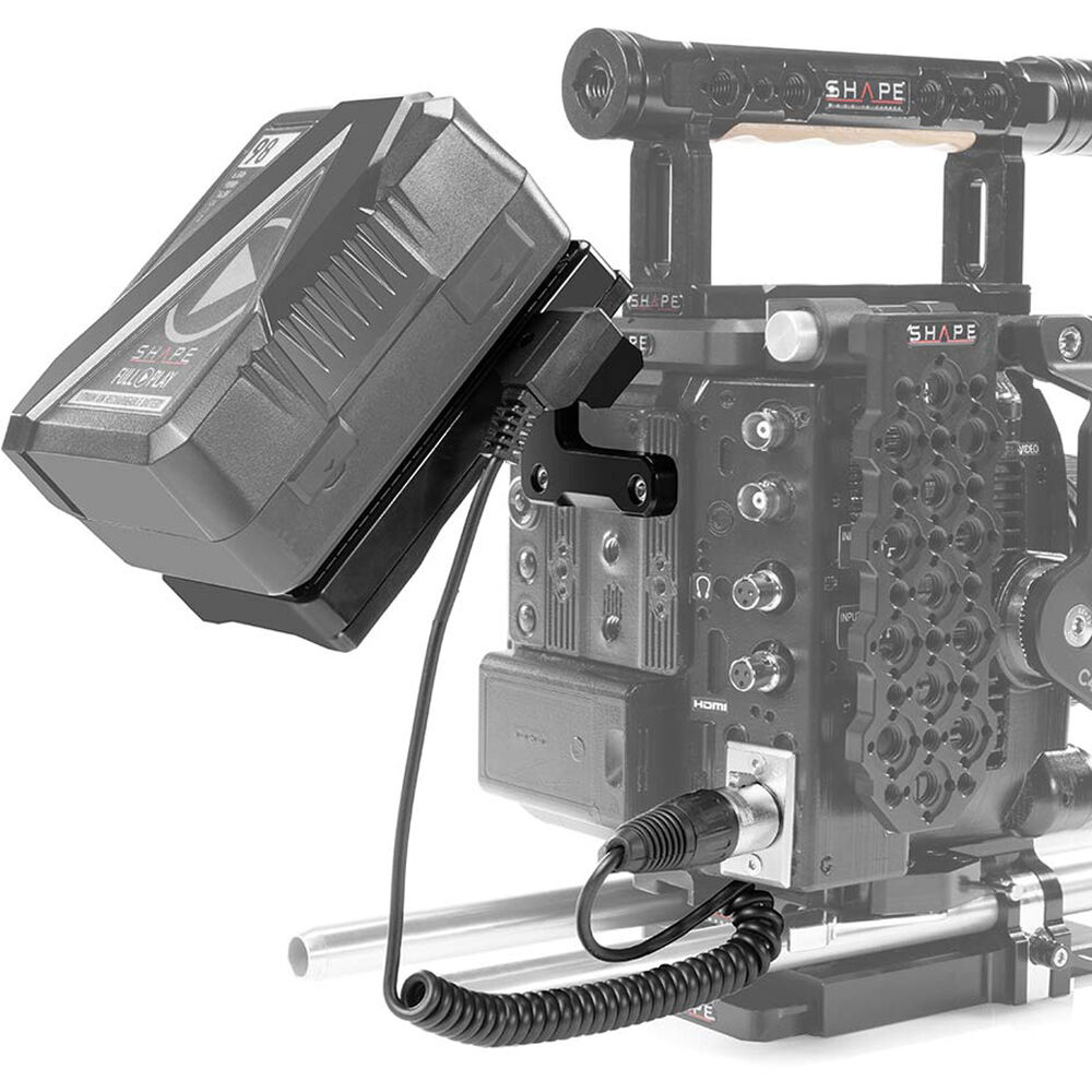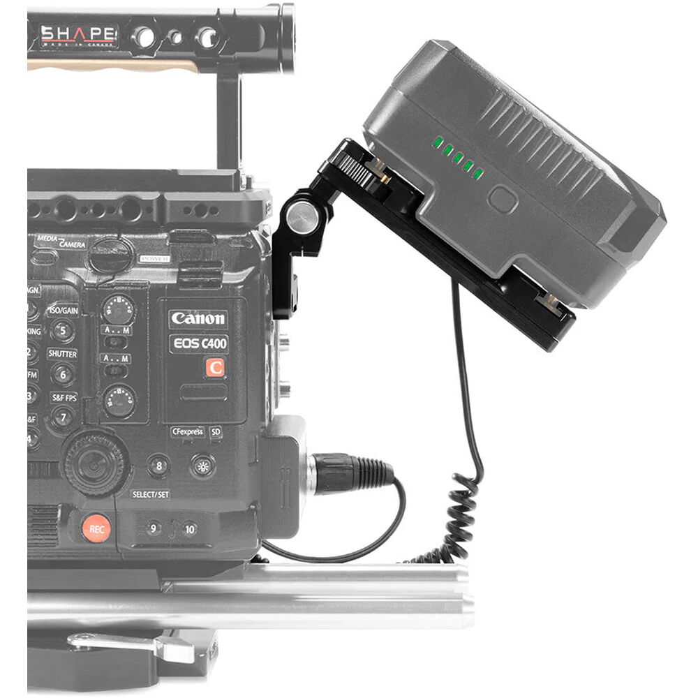The SHAPE Pivoting Battery Plate screws into the rear upper thread holes of the Canon EOS C400, allowing for the attachment of a Gold mount battery. Its pivoting design ensures access to the camera's battery compartment while providing hot-swapping capability. Along with a D-Tap port for powering the camera and accessories, the plate features a digital fuse for safe and reliable operation. Connect it with the included D-Tap to female 4-pin XLR power cable for maximum versatility. The system also incorporates SHAPE's patented 15mm push-button technology, enabling easy tilting for quick access to the rear connectors and BP battery. Enhance your Canon EOS C400 setup with this advanced battery plate solution.