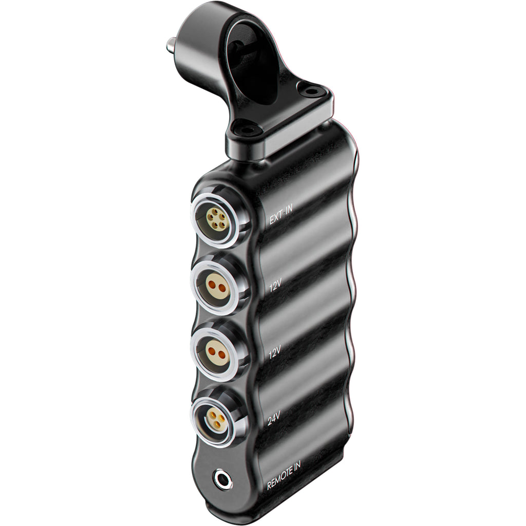 The D-Box provides 12V 2-pin, D-Tap, and 24V 3-pin ports to output power for the camera and accessories from a V-mount battery, and it supports hot swapping when using the DC input. The B-Box connects to the D-Box with the link cable and adds two 12V 2-pin ports and a 24V 3-pin port that can be used with run/stop communication using the included remote cable. The B-Box mounts onto an optional top plate using the included side mount.