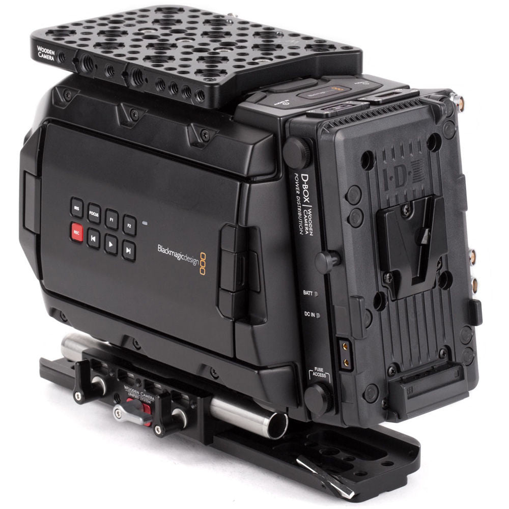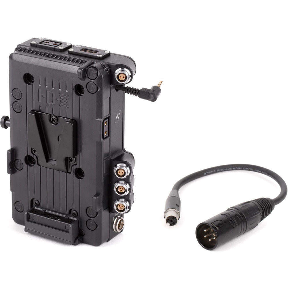 The D-Box for URSA Mini/Mini Pro from Wooden Camera is a V-Mount battery plate that passes power to your camera, has multiple power outputs, and features camera start/stop capability via the 3-pin Fischer connectors. It features three D-Tap ports, two 2-pin LEMO, two 3-pin Fischer connectors, a USB power port, as well as a 4-pin mini XLR power input (full-sized XLR to mini XLR adapter cable included). The D-Box incorporates a LANC connector that attaches to your URSA Mini/Mini Pro and enables start/stop functionality. All outputs are always on.
