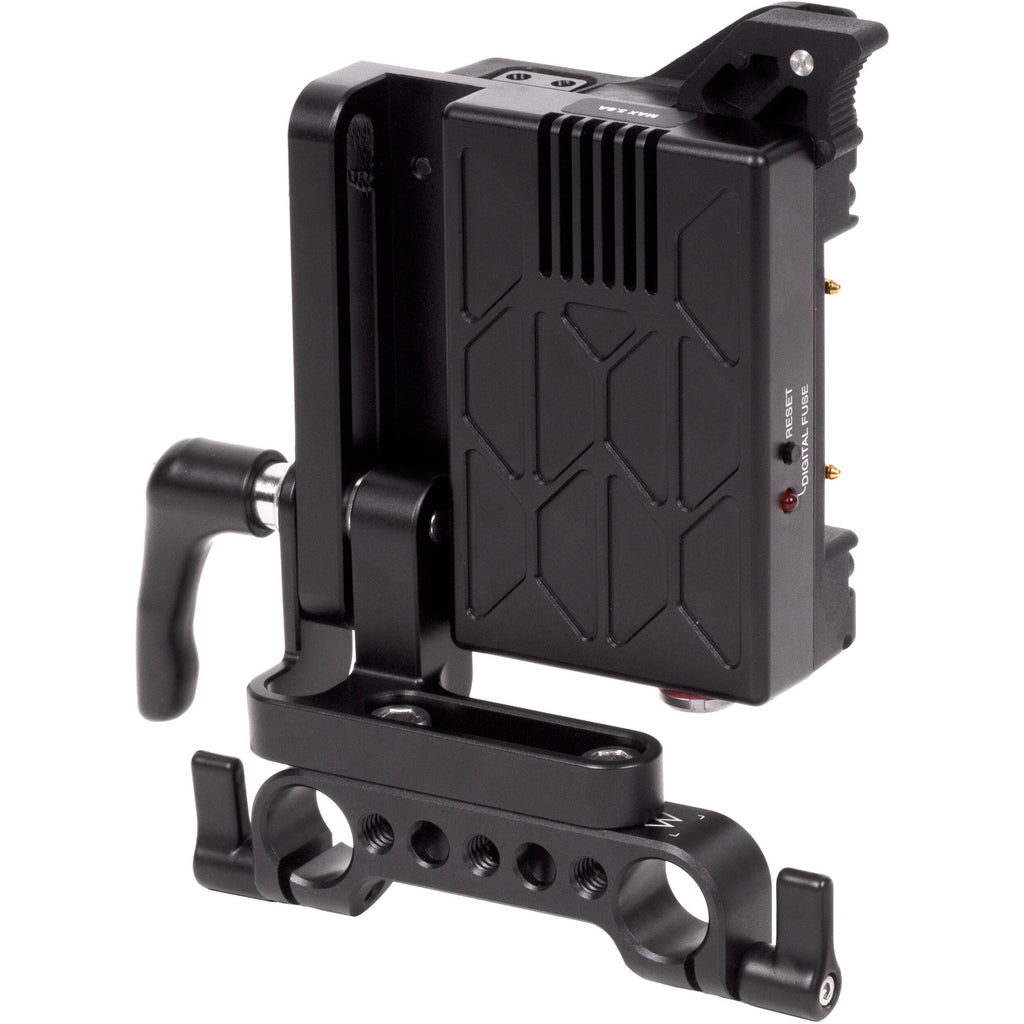The Micro Battery Slide Pro attaches to the 15mm LW rods on your rig with its integrated rod clamp and can be adjusted for optimal positioning to reduce strain on the power connections. A digital fuse within the power device cuts off the accessory outputs if the user exceeds the set current while keeping the camera output active. Once the accessories are reconfigured, the reset button can be pressed and the outputs will be restored.